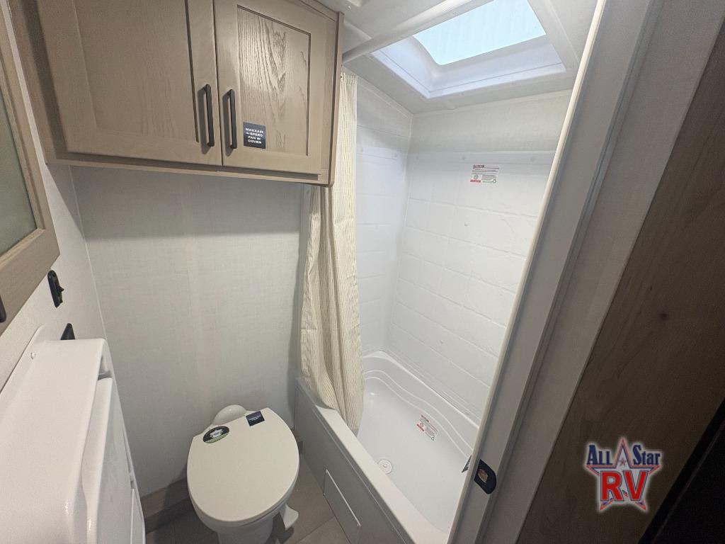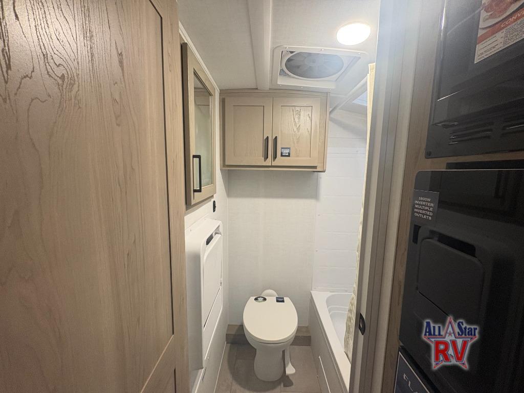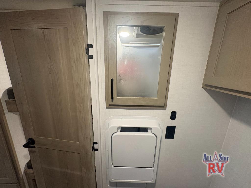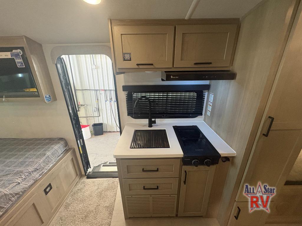 This spacious bunk trailer will work perfectly for a family or friend group that enjoys their own sleeping space, plus more floor space with the dinette slide out that can sleep one to two. There are two bunks so you or your kids can sleep. There is exterior storage for more outdoor gear, and interior storage found throughout. The cook will love having a pantry and overhead cabinets for snacks, canned goods, dishes and more. After making a warm meal, the 12V refrigerator can hold the leftovers. There is also a flip-down lavy sink in the full bath for added space when not in use!