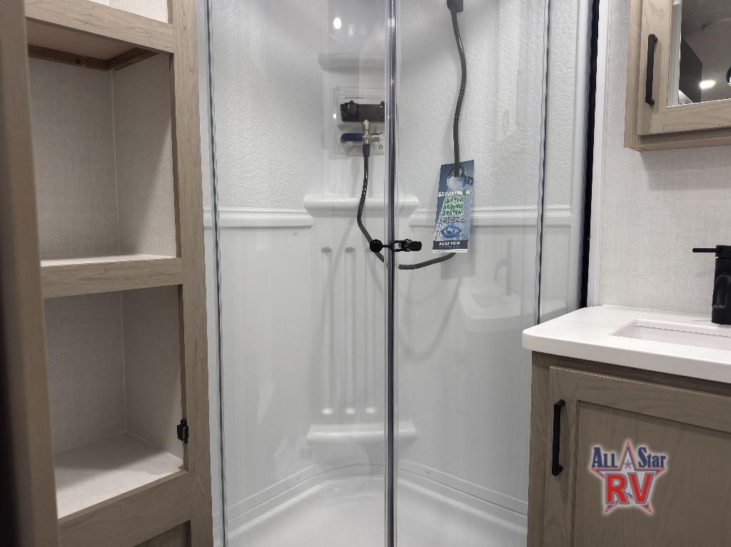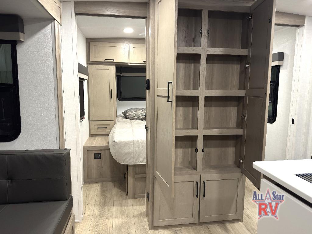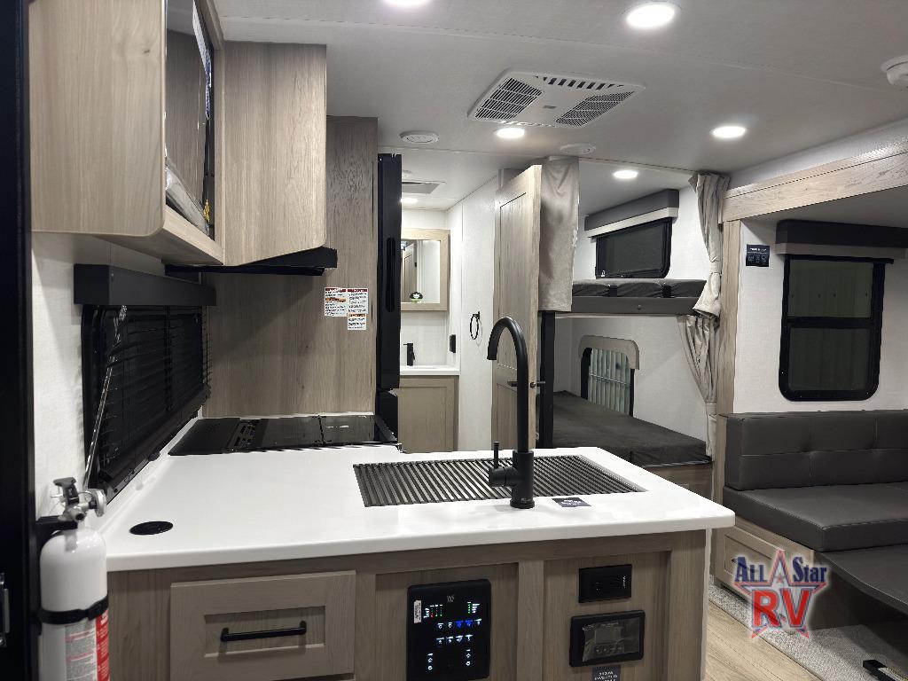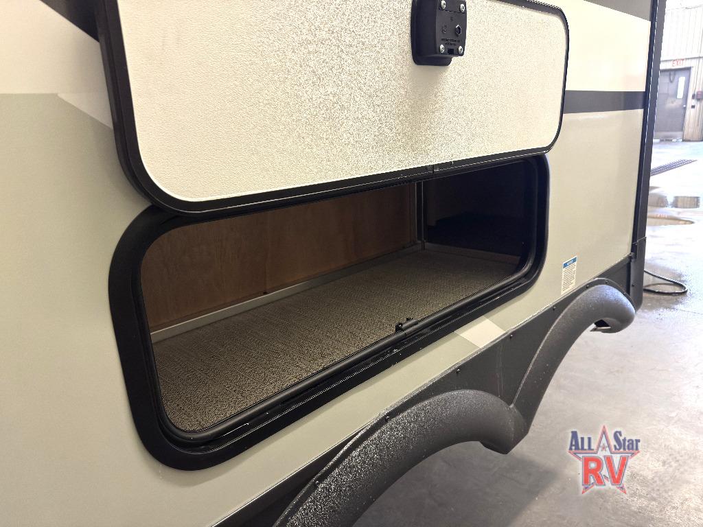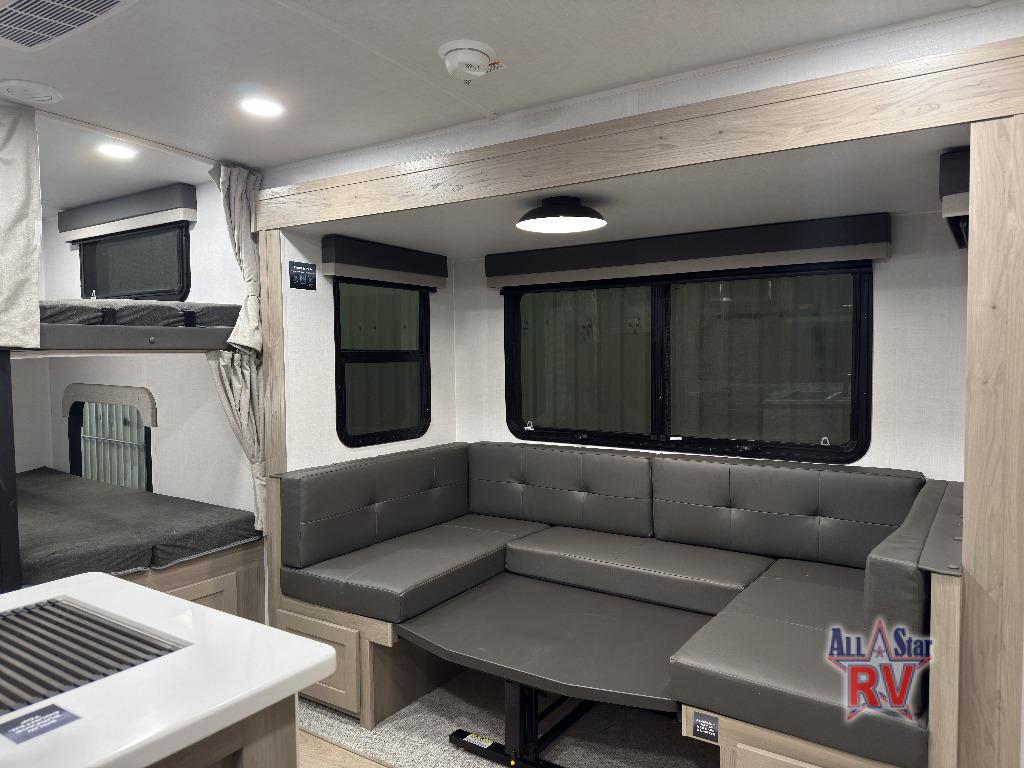 Camping in this single slide out travel trailer will make weekends at the campground comfy and hassle-free! Once you arrive, you can unload the pass-through storage, put out the 18' power awning, then relax in your camp chairs. And there is a full interior kitchen to make meals when you get hungry. Everyone can gather around the U-shaped dinette slide for meal times or game night, and there is a spacious pantry where you can store snacks! The bunk beds include a flip-up bottom bunk and an exterior bike door so you can easily pack camp gear away, and the full bath is right next to the bunks for easy nighttime use. Head up front to enjoy your own private bedroom with an RV queen bed, dual wardrobes, and flip-up storage!