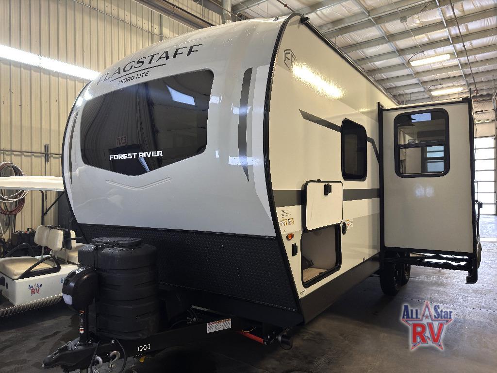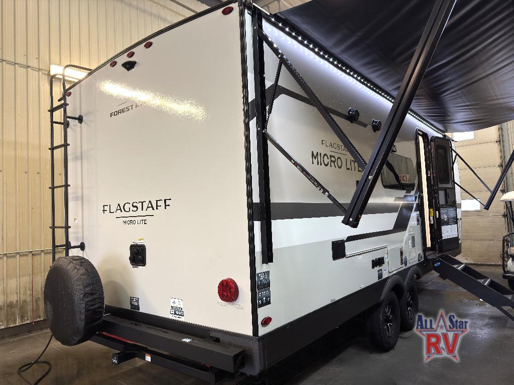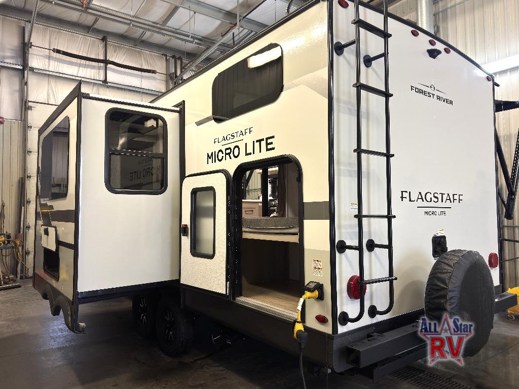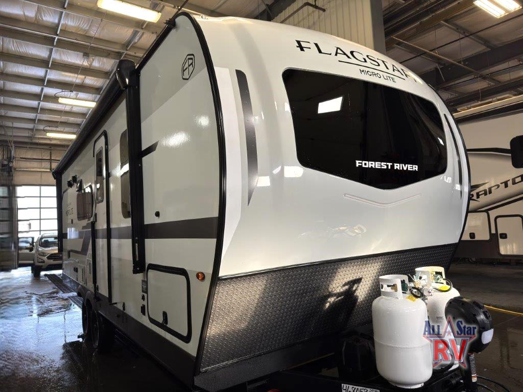 With any Flagstaff Micro Lite travel trailer by Forest River you will enjoy lightweight towing, durable construction, and added interior comforts to make each trip memorable! Each model features RoadTech tire pressure monitoring, Dexter Torflex axles, and nitrogen-filled Goodyear endurance tires for smooth towing from home to campground. The 6-sided aluminum framed construction provides a strong foundation so you can enjoy your RV for years to come, plus the radiant foil in the front cap, underbelly and slides help insulate your trailer. Additional exterior features include a 200W solar panel, back-up camera prep, frameless windows, and slam baggage doors. Each model includes the Great Expectations Package with roller shades, solid surface kitchen countertops, and hidden hinge cabinet doors. There is also an exterior hot/cold water port, outside speakers, a power tongue jack and stabilizer jacks, plus many more conveniences.