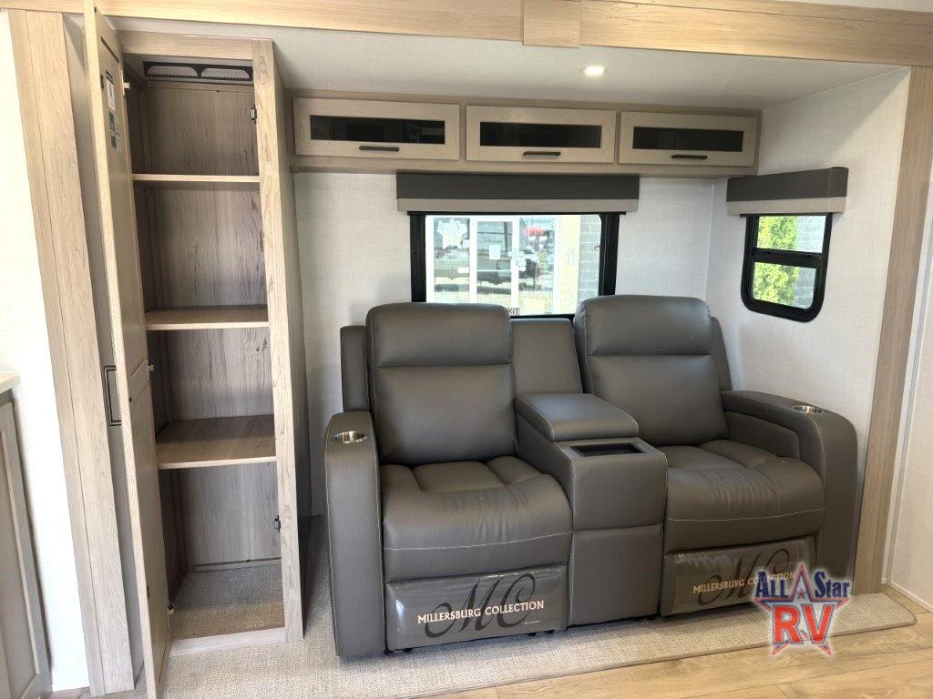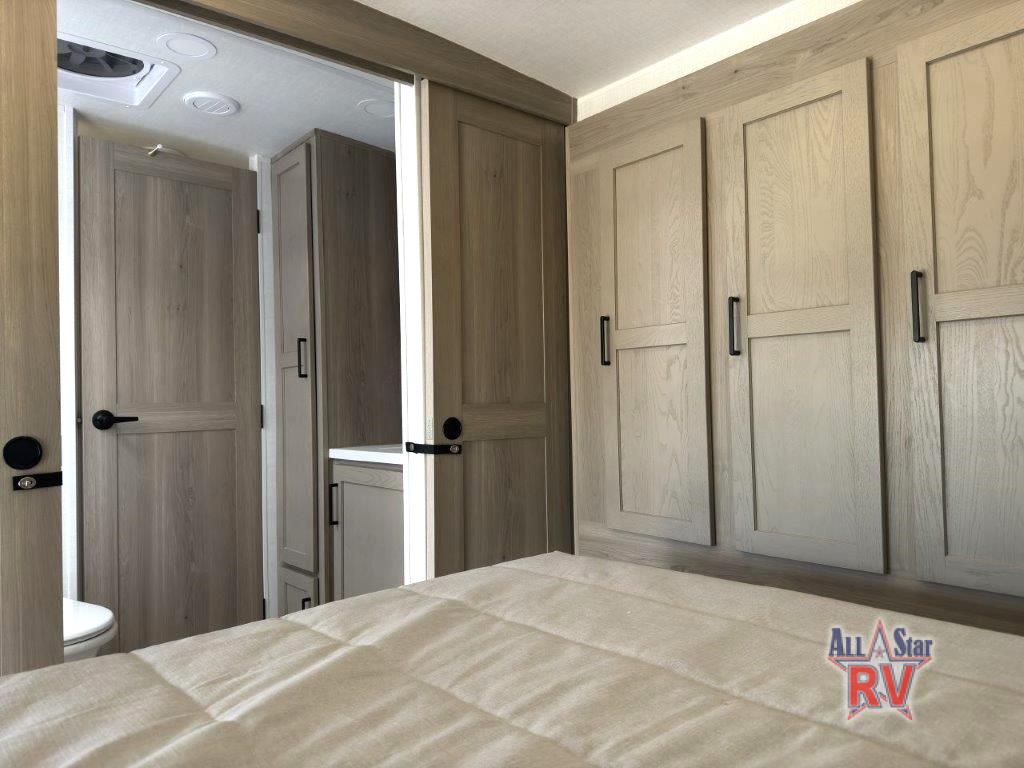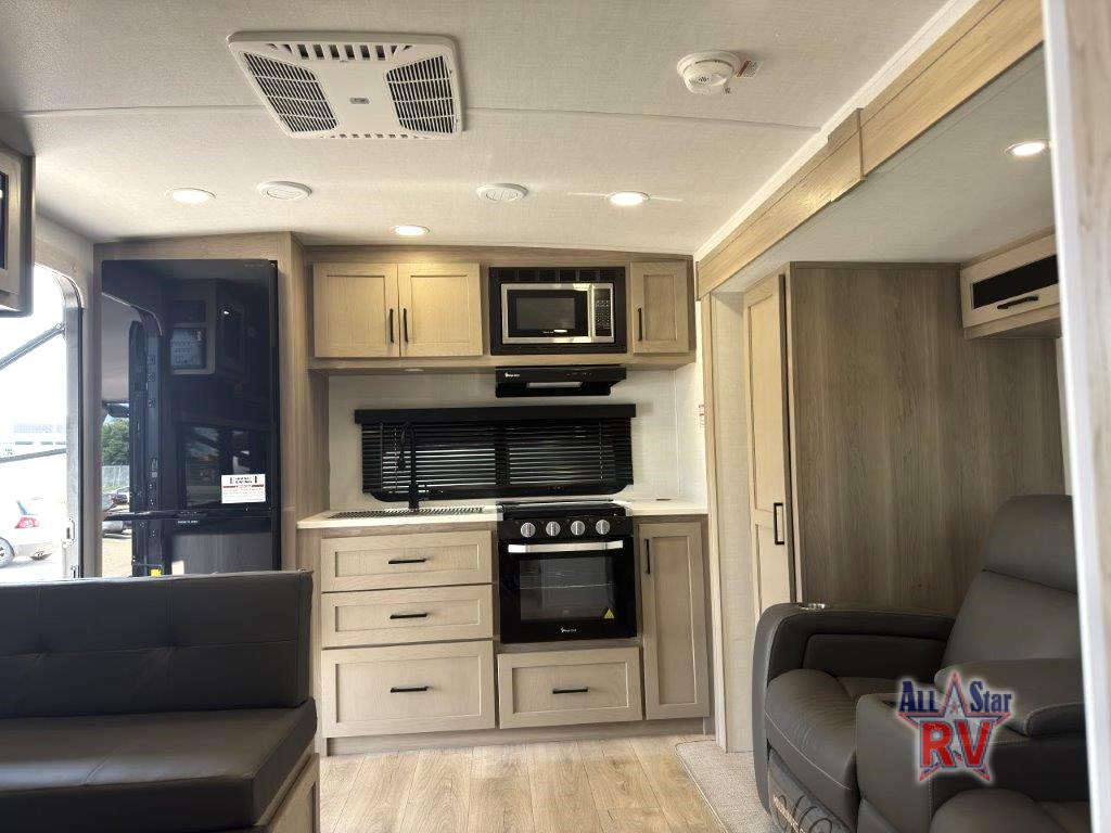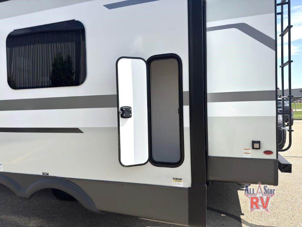 Trips to your favorite campground are made complete with this dual slide out, dual entry trailer! One entry goes straight into the front master bedroom where you'll find an RV queen bed with flip-up storage, a wardrobe slide out, and easy access into the walk-through bath. Once you're through the bath, you'll find the main living area, rear kitchen, and the second entry door at the back. Your crew can play a game at the 39" booth dinette or relax on the theater seat across from the TV. The kitchen includes everything you need to prepare meals in the morning, including a three burner cooktop and microwave oven, plus a 12V refrigerator and a pantry for food storage.