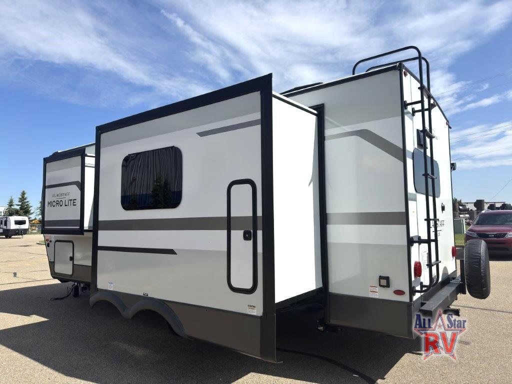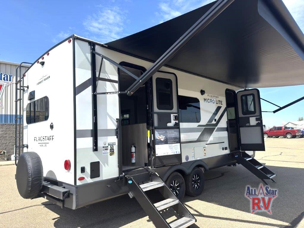 With any Flagstaff Micro Lite travel trailer by Forest River you will enjoy lightweight towing, durable construction, and added interior comforts to make each trip memorable! Each model features RoadTech tire pressure monitoring, Dexter Torflex axles, and nitrogen-filled Goodyear endurance tires for smooth towing from home to campground. The 6-sided aluminum framed construction provides a strong foundation so you can enjoy your RV for years to come, plus the radiant foil in the front cap, underbelly and slides help insulate your trailer. Additional exterior features include a 200W solar panel, back-up camera prep, frameless windows, and slam baggage doors. Each model includes the Great Expectations Package with roller shades, solid surface kitchen countertops, and hidden hinge cabinet doors. There is also an exterior hot/cold water port, outside speakers, a power tongue jack and stabilizer jacks, plus many more conveniences.