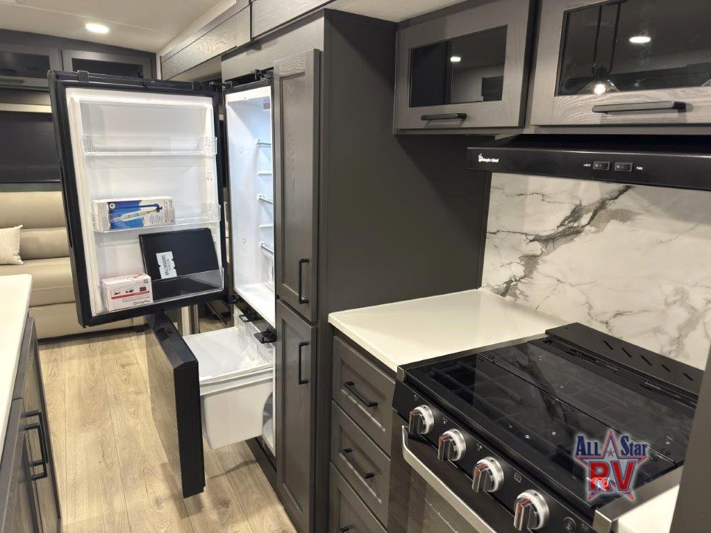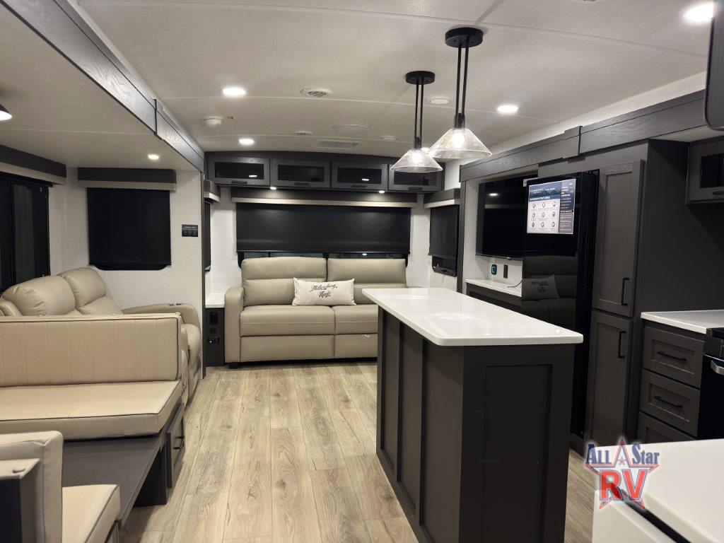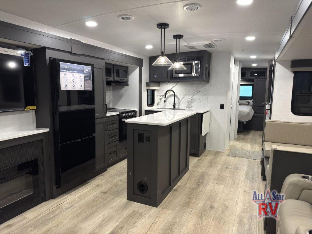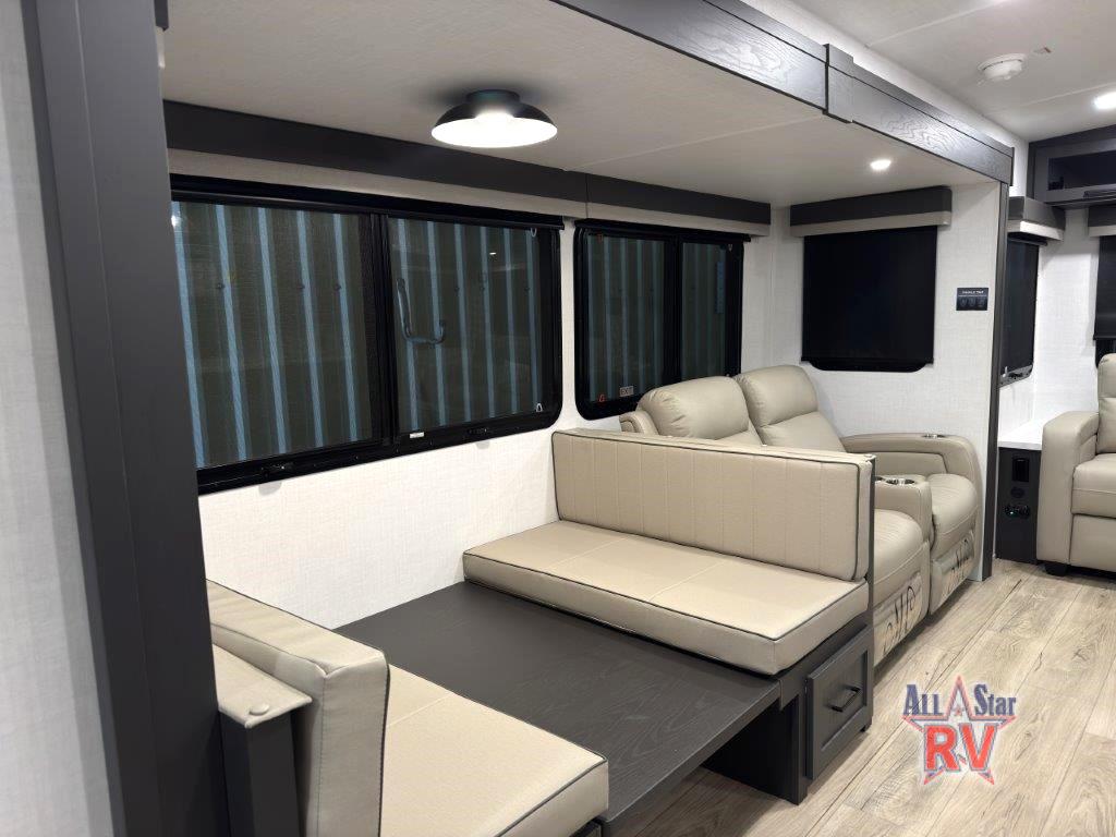 You'll feel right at home when staying in this spacious travel trailer. There are dual opposing slides in the combined kitchen and living area, and the large kitchen island will give the chef of your group more counter space to prep meals. Your crew can dine at the booth dinette, relax on the theater seat, and sleep on the hide-a-bed sofa. You'll find your own space in the front private bedroom that includes a queen bed, triple wardrobes, and a TV option. Head outdoors to find two power awnings, a rear 2" receiver hitch, and a pass-thru storage with an optional steel sliding tray.