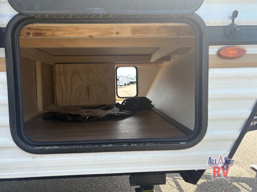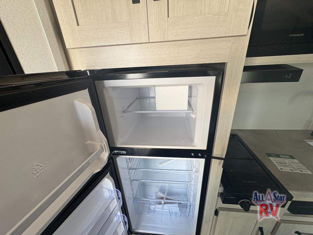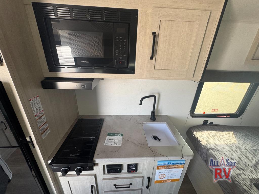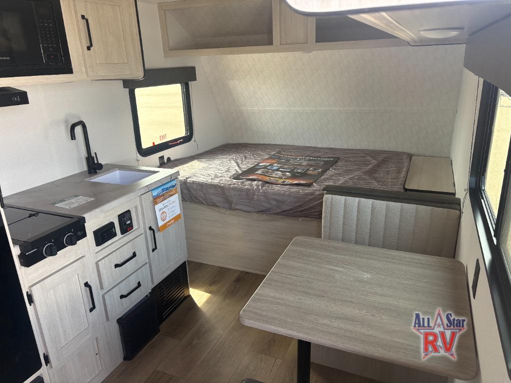 It will be so easy to enjoy camping trips in this single axle travel trailer! There is a front RV queen bed with flip-up storage at the foot of the bed for your belongings, and an additional guest or two little ones can sleep on the booth dinette when it's not being used to dine at. A full kitchen includes a stainless two burner cooktop and stainless microwave to cook meals each day, and the 4.3 cu. ft. 12V black glass refrigerator will keep your food fresh. And a private bath with a toilet and shower will let you freshen up without having to use the camp's facilities!