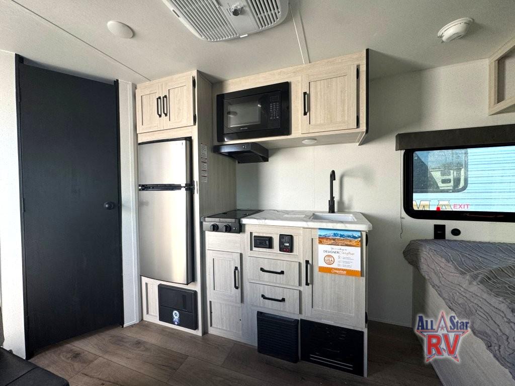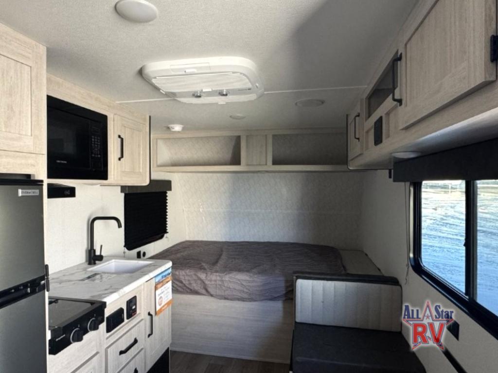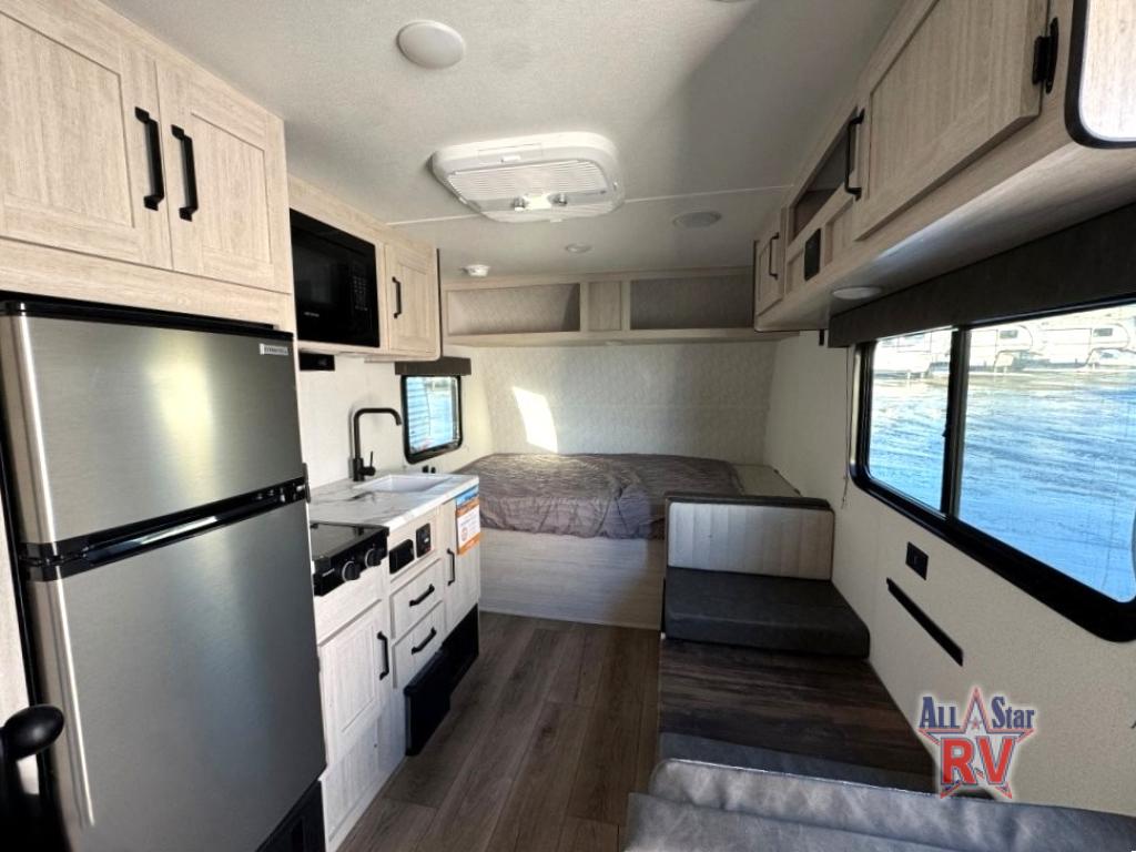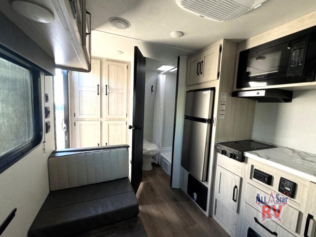 It will be so easy to enjoy camping trips in this single axle travel trailer! There is a front RV queen bed with flip-up storage at the foot of the bed for your belongings, and an additional guest or two little ones can sleep on the booth dinette when it's not being used to dine at. A full kitchen includes a two-burner cooktop and microwave to cook meals each day, and the 12V black glass refrigerator will keep your food fresh. And a private bath with a toilet and shower will let you freshen up without having to use the camp's facilities!