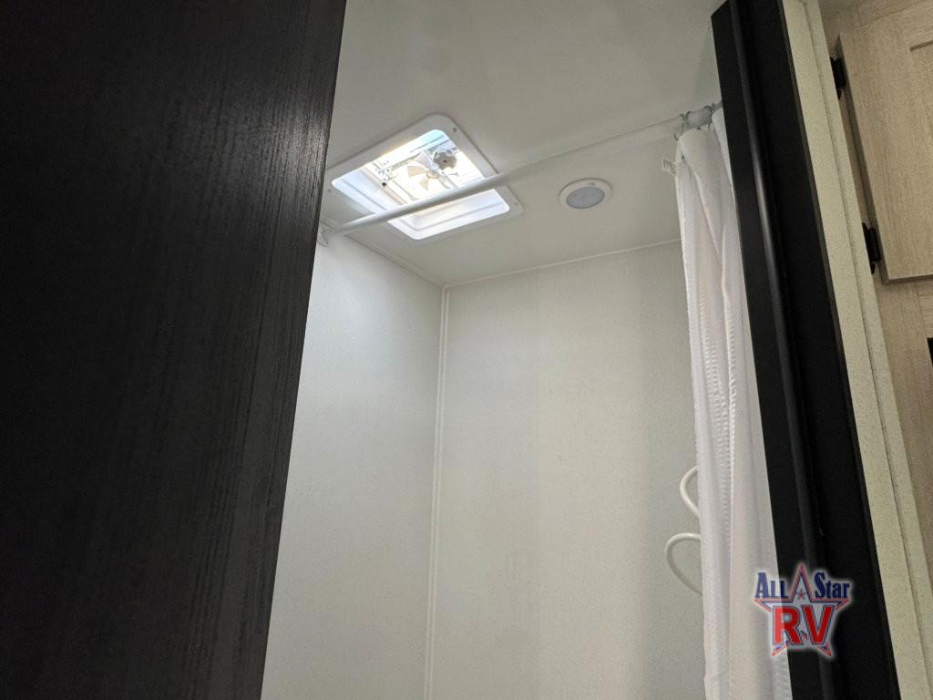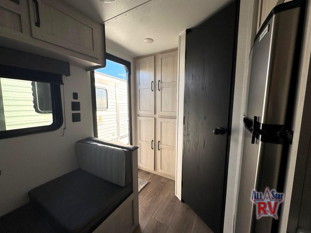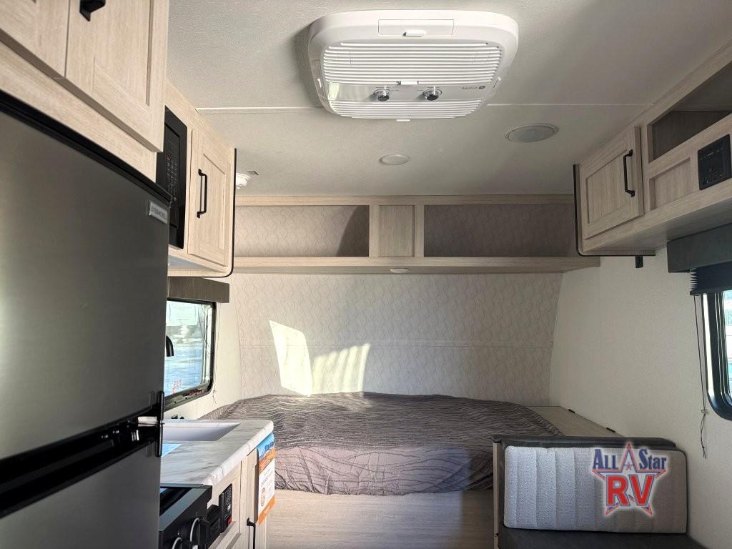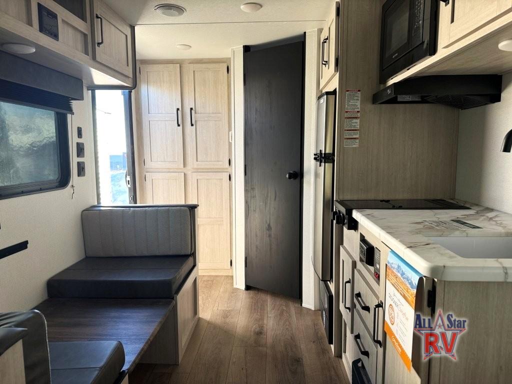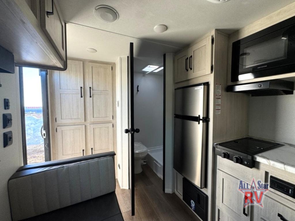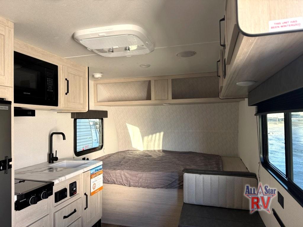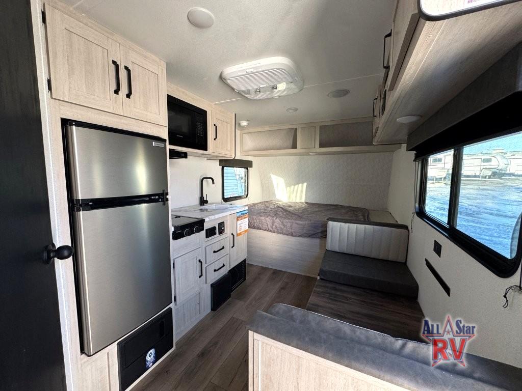 It will be so easy to enjoy camping trips in this single axle travel trailer! There is a front RV queen bed with flip-up storage at the foot of the bed for your belongings, and an additional guest or two little ones can sleep on the booth dinette when it's not being used to dine at. A full kitchen includes a two-burner cooktop and microwave to cook meals each day, and the 12V black glass refrigerator will keep your food fresh. And a private bath with a toilet and shower will let you freshen up without having to use the camp's facilities!
