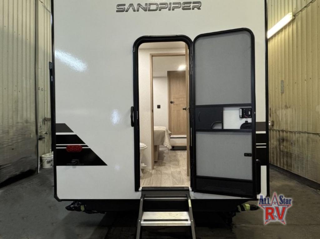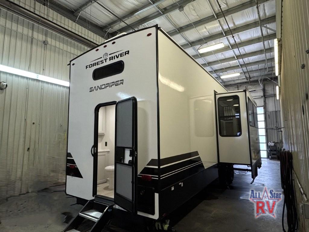 With each Sandpiper Destination Trailer by Forest River you will enjoy many luxurious features, such as crown molding over the kitchen cabinets, solid surface kitchen countertops, a memory foam mattress, plus so much more. The extra large picture windows throughout let natural light in and provide beautiful outdoor views, and each model includes three or more slides for added interior space. You'll find many exterior conveniences, like the porch light with an interior switch, the rain gutters with extra long drip spouts to prevent black streaking, and an electric awning with LED light strip, plus more! You will stay comfortable year around with dual 15,000 A/C units plus each model is constructed with an Underbelly Armor for better protection and insulation!