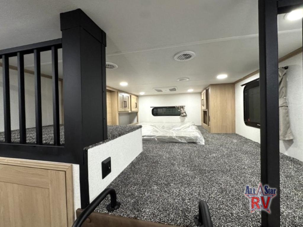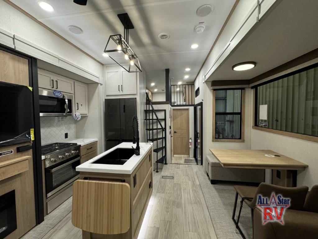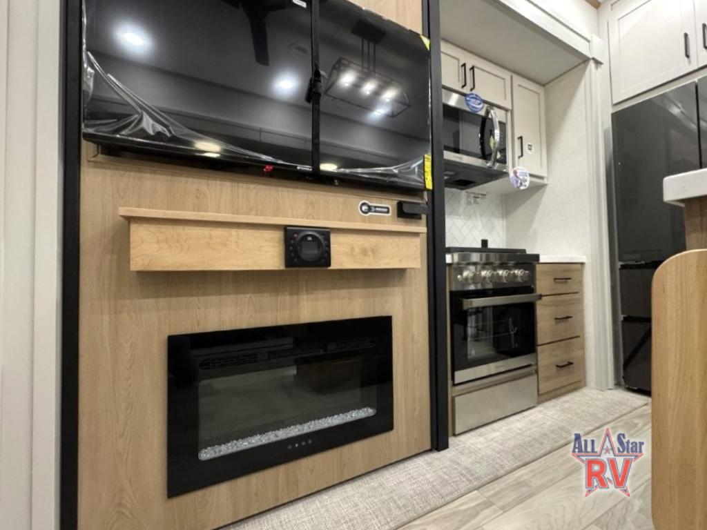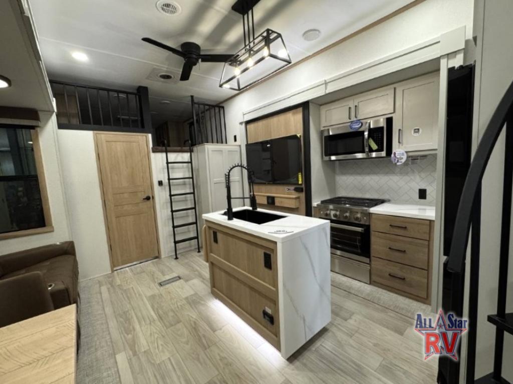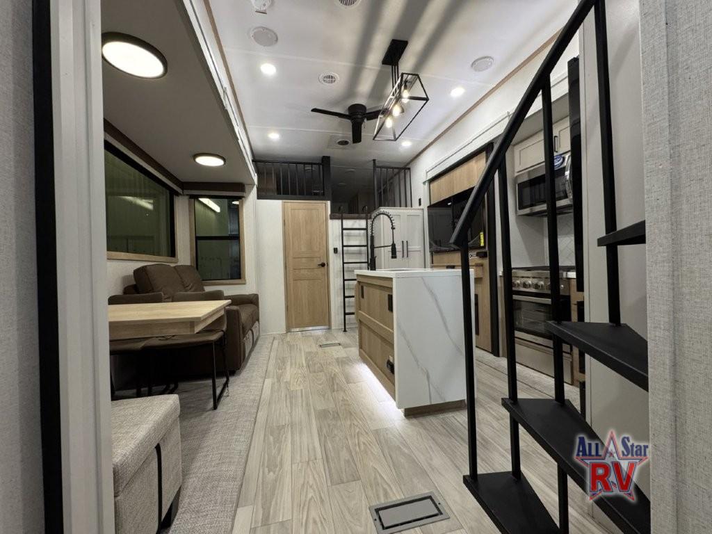 You won't believe the comfort and convenience found in this destination trailer. There are two private bedrooms; one up front with a queen bed slide out and storage space, and one in back with a queen bed slide out and a half bath! There is even washer and dryer prep here if you want to add those appliances and the second entry door is also found in this location so you can easily slip out in the morning. Above each of these rooms is a loft providing three total bunk mats for sleeping, storage cabinets, and TV prep if you want to add entertainment. Everyone can meet in the combined kitchen and living room that includes dual opposing slides, a 60" theater seating across from a 50" flat screen TV and fireplace, plus a free-standing table with chairs and a bench to dine at. The chef of your group will love the large kitchen island, Chef Collection three burner range, and a 16.2 cu. ft. refrigerator for food storage.