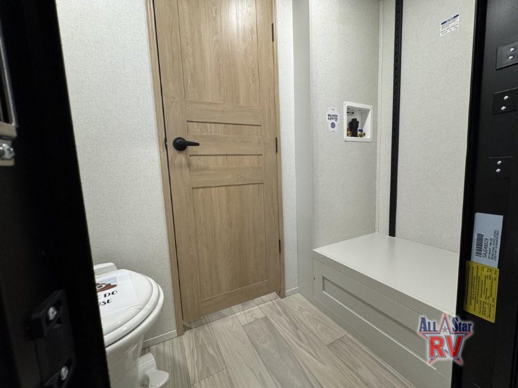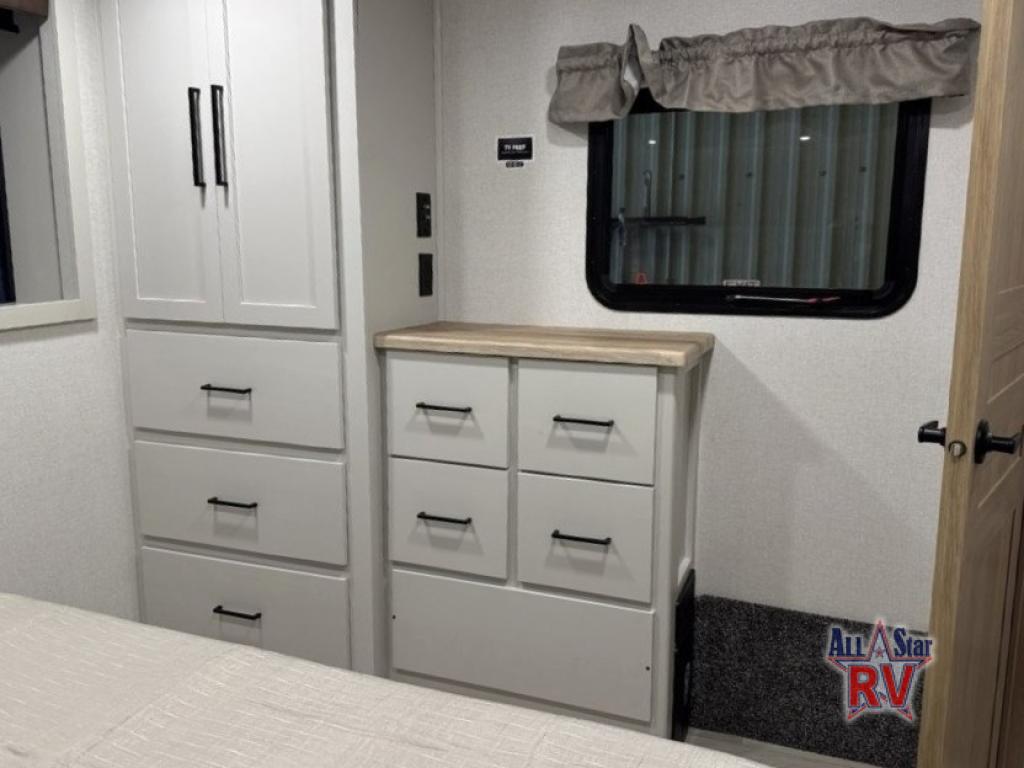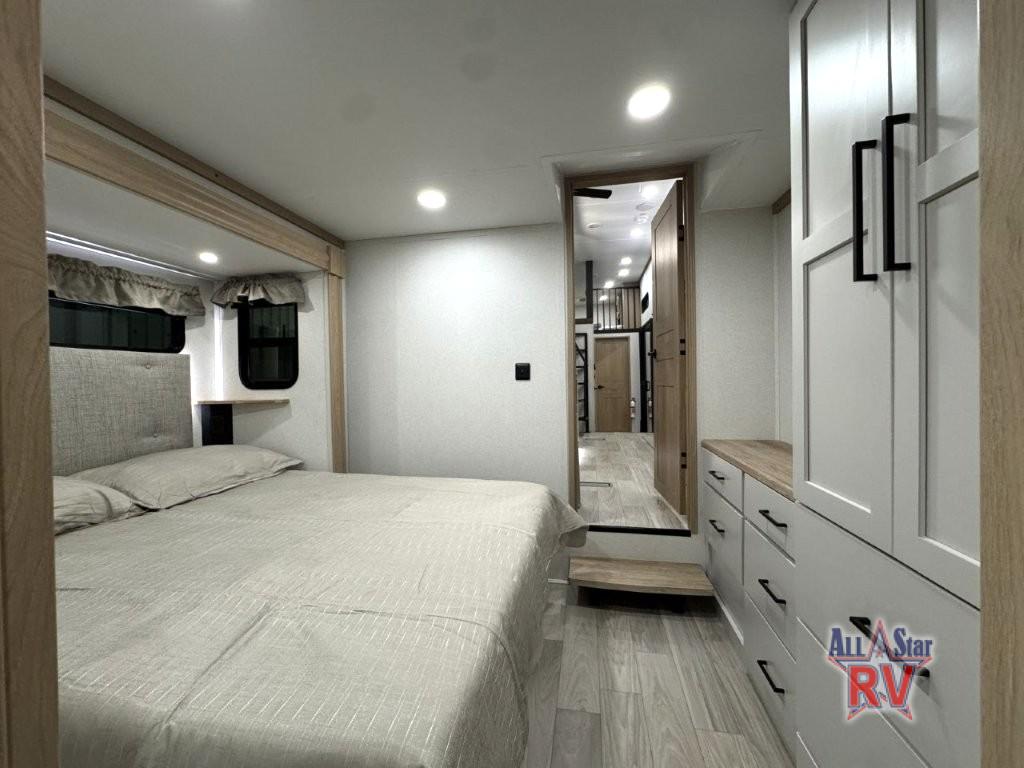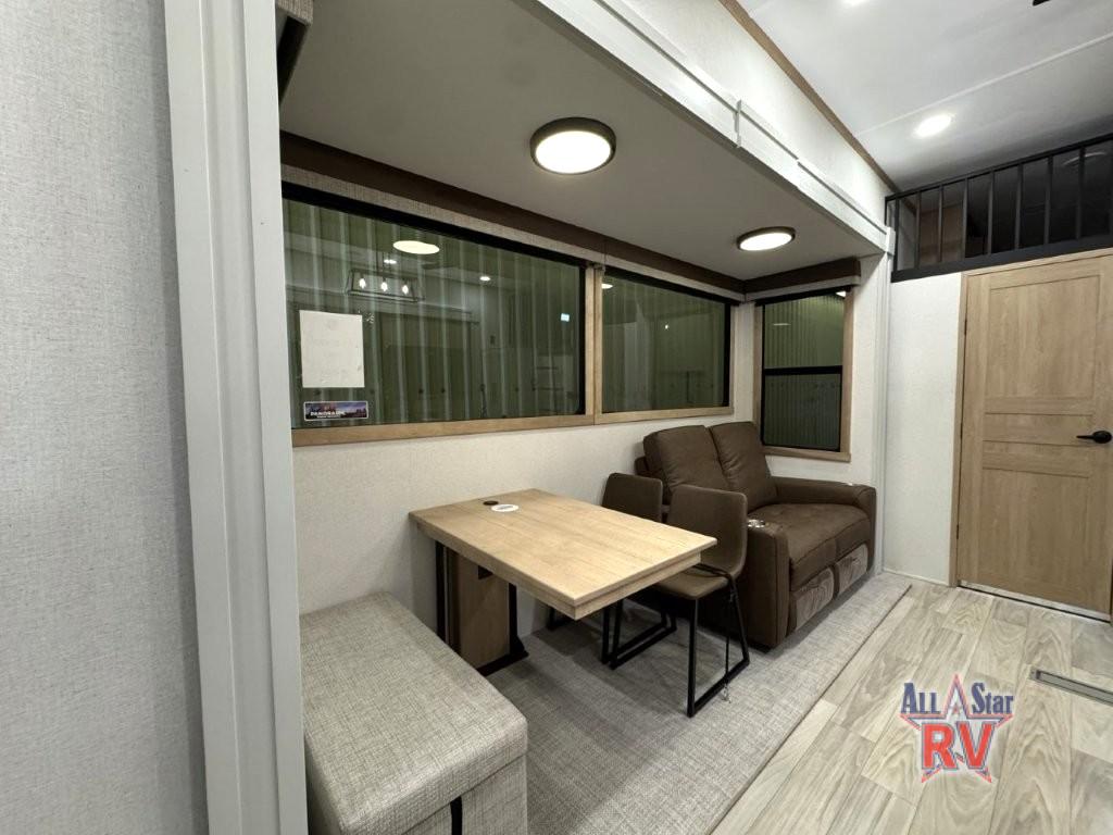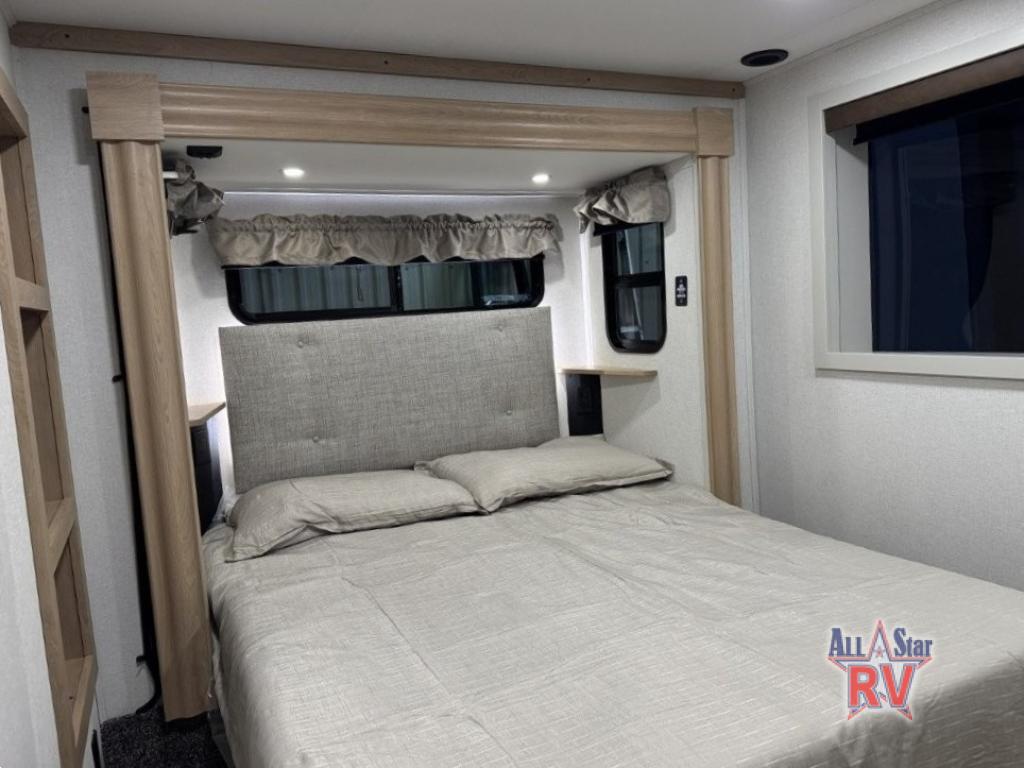 You won't believe the comfort and convenience found in this destination trailer. There are two private bedrooms; one up front with a queen bed slide out and storage space, and one in back with a queen bed slide out and a half bath! There is even washer and dryer prep here if you want to add those appliances and the second entry door is also found in this location so you can easily slip out in the morning. Above each of these rooms is a loft providing three total bunk mats for sleeping, storage cabinets, and TV prep if you want to add entertainment. Everyone can meet in the combined kitchen and living room that includes dual opposing slides, a 60" theater seating across from a 50" flat screen TV and fireplace, plus a free-standing table with chairs and a bench to dine at. The chef of your group will love the large kitchen island, Chef Collection three burner range, and a 16.2 cu. ft. refrigerator for food storage.