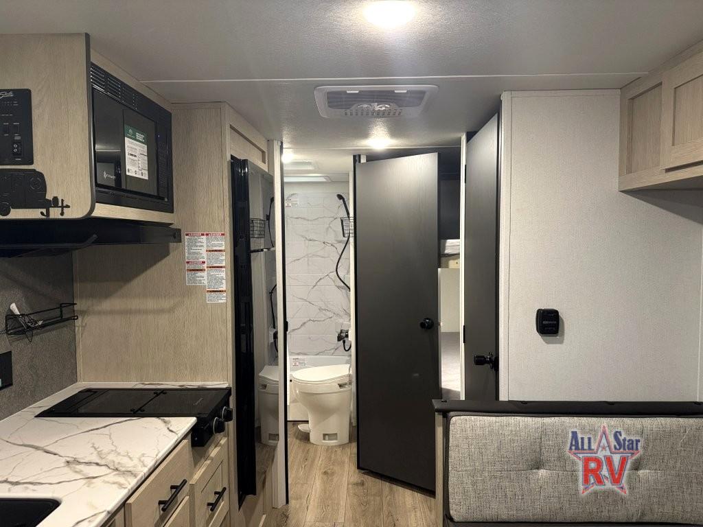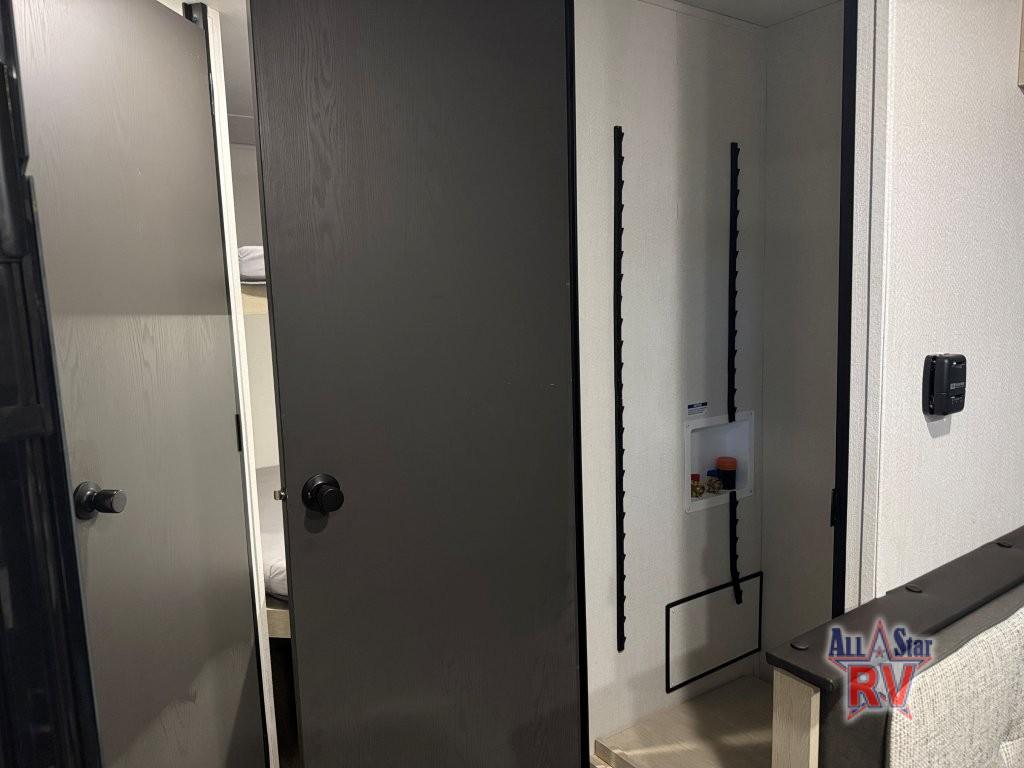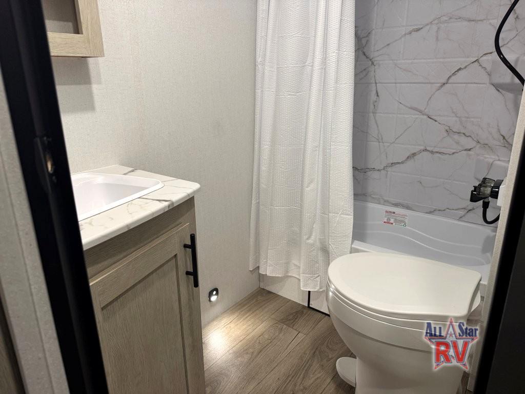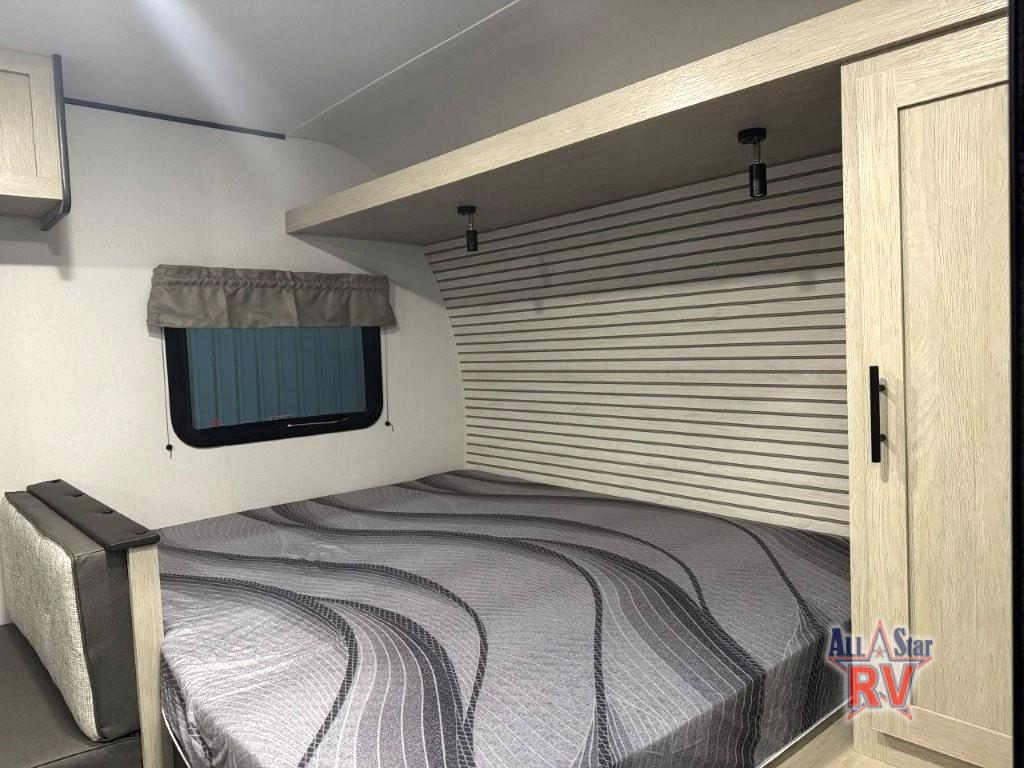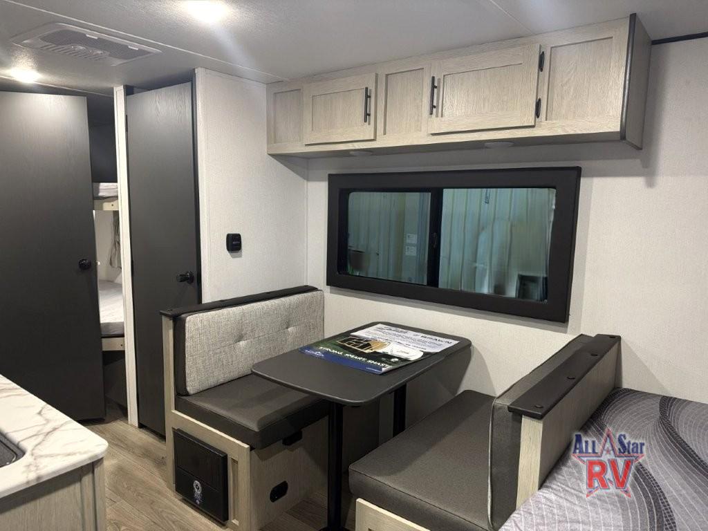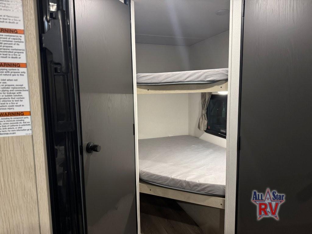 The double-size bunks found in this travel trailer will be perfect for guests, while you take the front RV queen bed! There is a full bath right beside the bunks for easy nighttime use, and the front bed includes a wardrobe at the foot of the bed for your things. Once the chef of your group has made lunch in the kitchen, you can dine at the booth dinette or take your plate outdoors to sit at the campground picnic table. There is also a kitchen pantry that is washer/dryer ready if you plan to add those appliances. This model also includes plenty of storage space, including an exterior pass-through for fishing poles, hiking gear, and more!