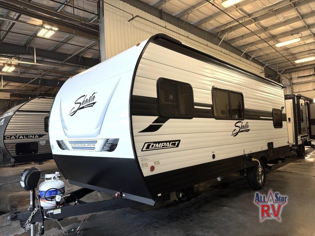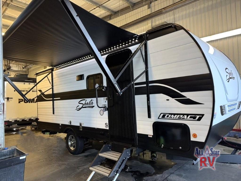 With any Compact travel trailer by Shasta RVs, you will enjoy the camping lifestyle in an easy-to-tow, lightweight unit! Each model includes four stabilizer jacks to keep your travel trailer secure at the campground, and an optional power tongue jack can be added for more convenience. You will appreciate having a tankless water heater for endless hot showers, an 8K BTU A/C to keep you cool, plus solar and back-up camera prep. The interior of each Compact travel trailer includes seamless countertops, kitchen and bath amenities, a Bluetooth portable speaker, plus storage space for all your belongings.