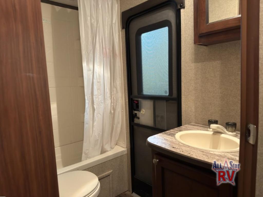 In the rear of the unit you will find a complete bath in the rear right corner with private entry. There is a tub/shower, toilet and sink.