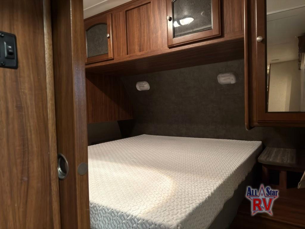 The front bedroom features a comfy queen size bed with storage on either side of the bed, and overhead storage as well.