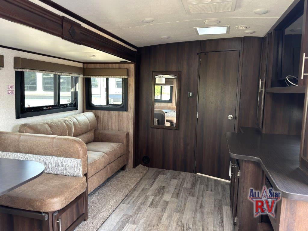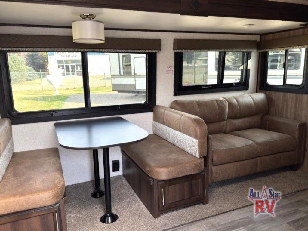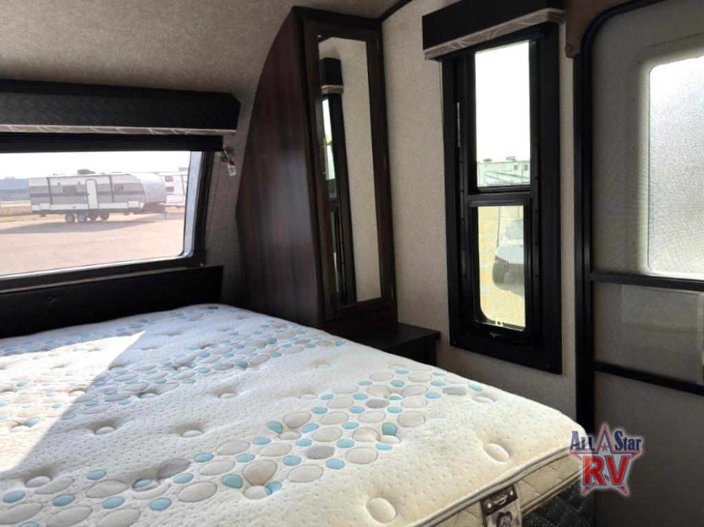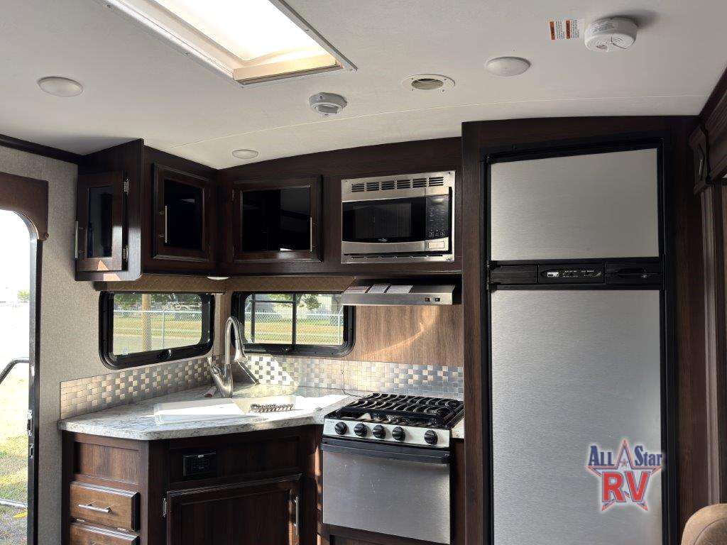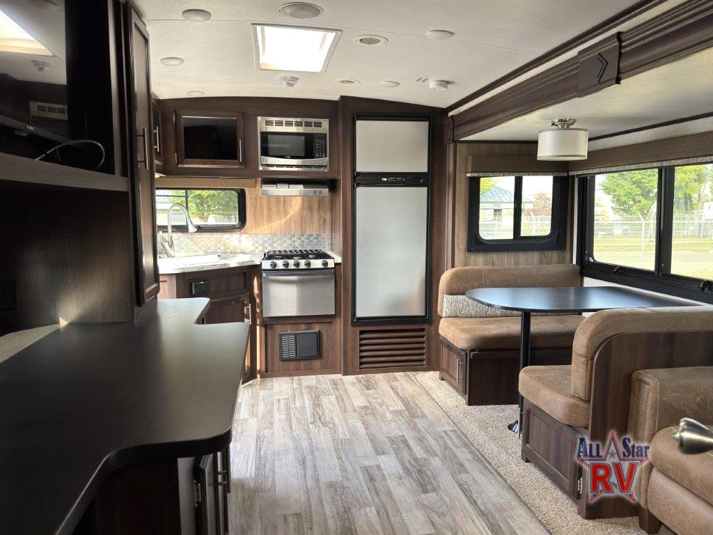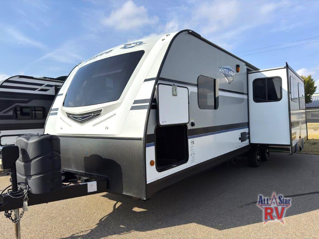 For worry-free family fun, take your next adventure in this White Hawk travel trailer. The booth dinette and tri-fold sofa add plenty of seating space to the living area so that you can enjoy a movie night on the 39" LED TV with the whole family, and the rear kitchen with residential appliances gives you the perfect space to create those movie-night snacks everyone loves. The walk-through bathroom gives you the extra room that you need as you get ready for the day, and the skylight brightens up the entire space with the sunshine that it brings in each morning. Because this trailer has two entry/exit doors, the front bedroom is able to have its own private entrance to and from the trailer.