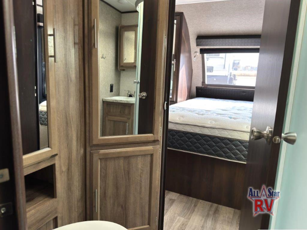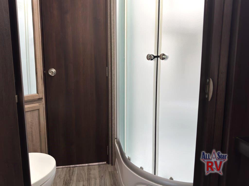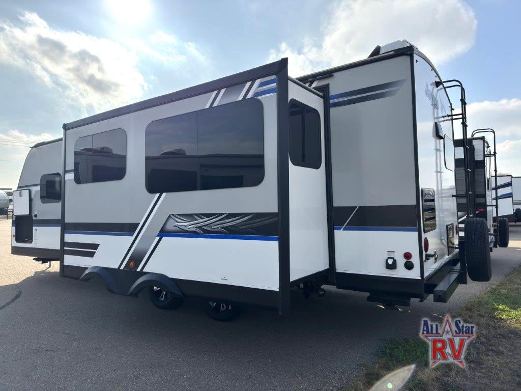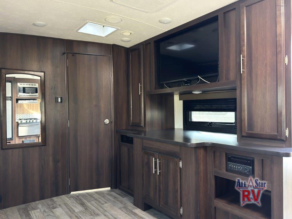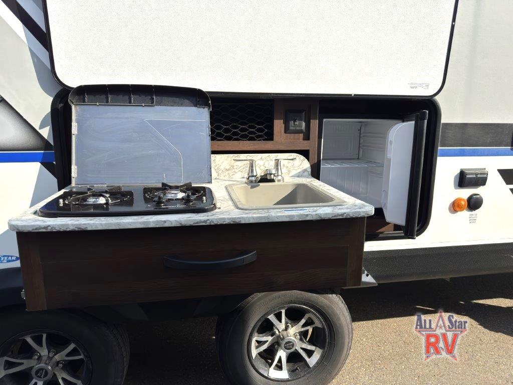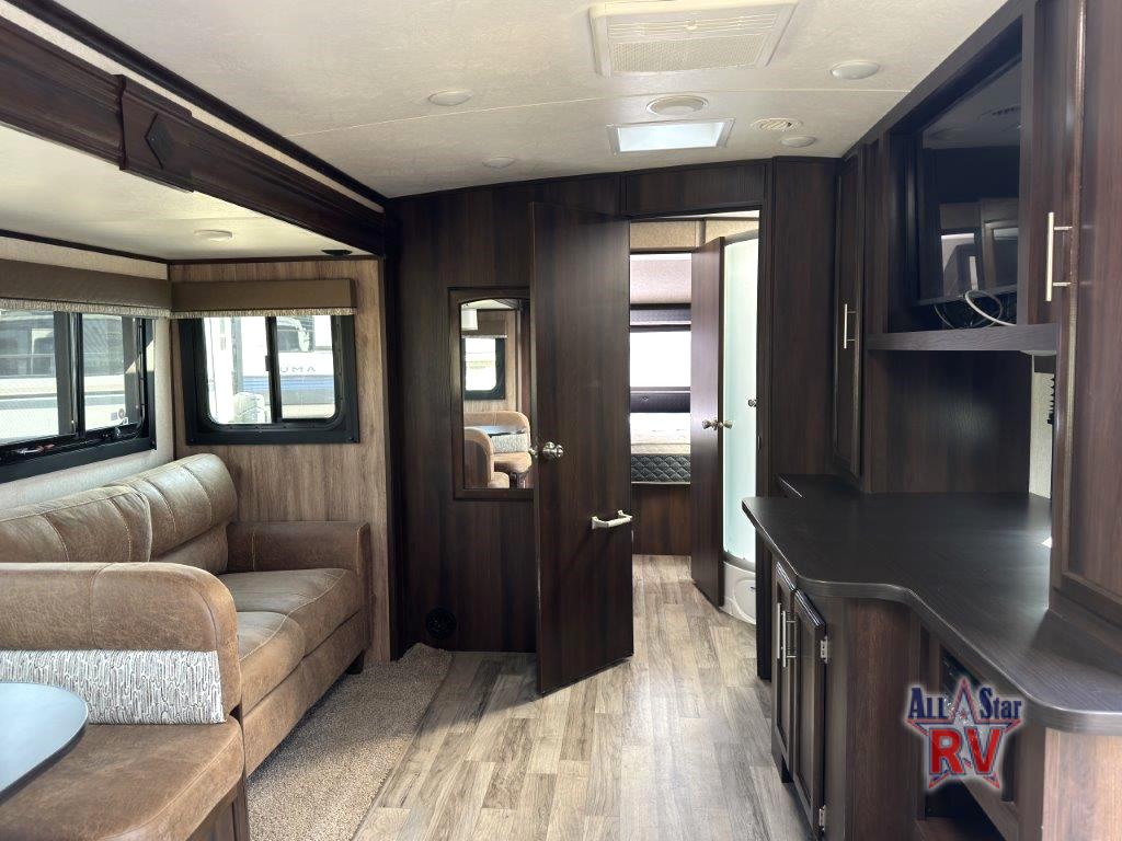 For worry-free family fun, take your next adventure in this White Hawk travel trailer. The booth dinette and tri-fold sofa add plenty of seating space to the living area so that you can enjoy a movie night on the 39" LED TV with the whole family, and the rear kitchen with residential appliances gives you the perfect space to create those movie-night snacks everyone loves. The walk-through bathroom gives you the extra room that you need as you get ready for the day, and the skylight brightens up the entire space with the sunshine that it brings in each morning. Because this trailer has two entry/exit doors, the front bedroom is able to have its own private entrance to and from the trailer.