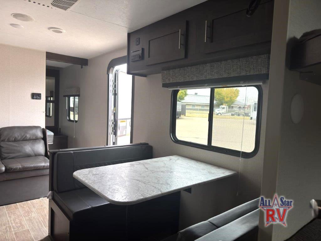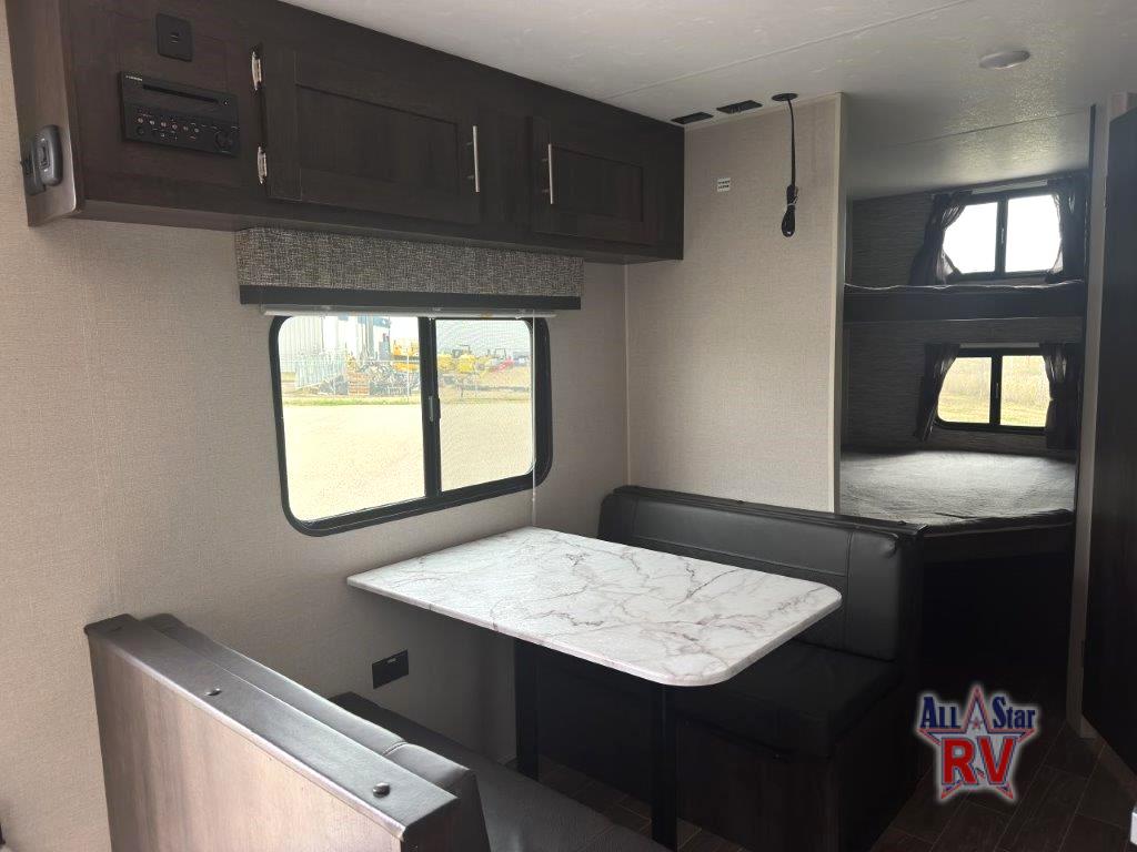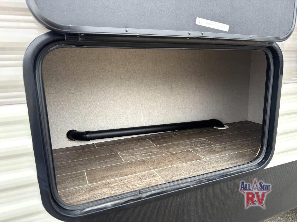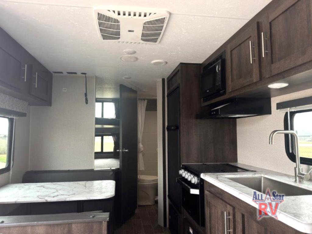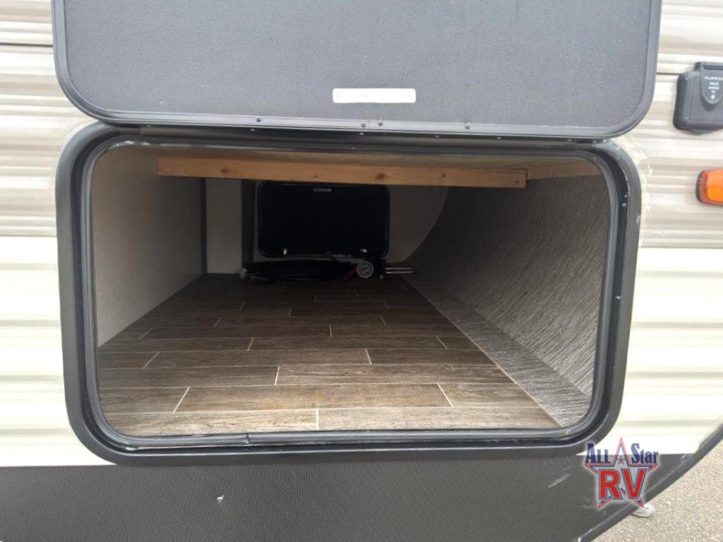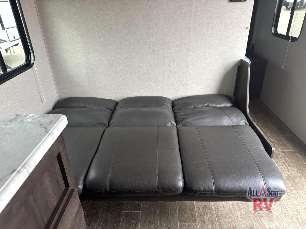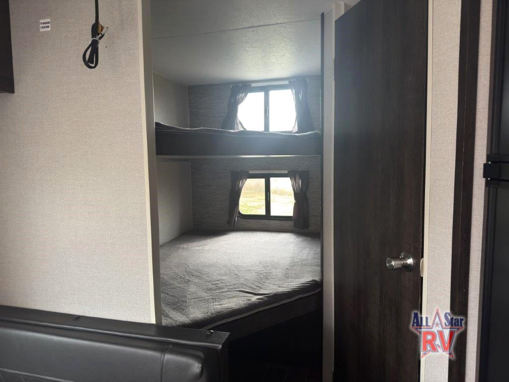 You will find lots of storage throughout the inside, and outside in the pass-through compartment for the larger camp gear and the storage door under the bunks in the rear. So load up and head out for a weekend of outdoor adventure. Once you have arrived you can quickly set up the 14' power awning and hit the trails, the lake, or relax. Inside someone can make lunch or dinner using the drop-in cooktop with glass cover and oven or the microwave, and store leftovers in the 10 cu. ft. refrigerator. When it's time to go to sleep, the kids will love their double-size bunks, you will love your queen bed and your friends can sleep on the furniture.