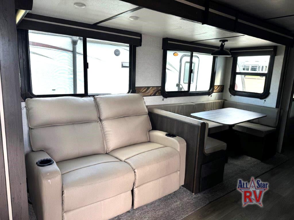 Your family or group of friends will love camping in this spacious travel trailer. The large slide out provides more space to let the dog nap on the floor, and the U-shaped dinette and tri-fold sofa here can double as their sleeping space at night. The chef of the family will have their choice to cook indoors, or outdoors on the outside kitchen, plus there is a power awning with LED lights to provide protection from the elements. Everyone can easily clean up in the spacious full rear bath that includes plenty of counter space and a closet that has been prepped to add an optional washer and dryer for convenience.