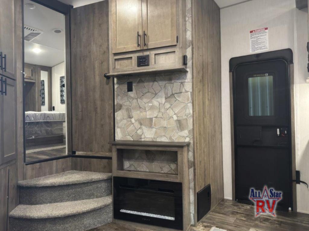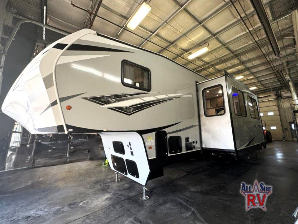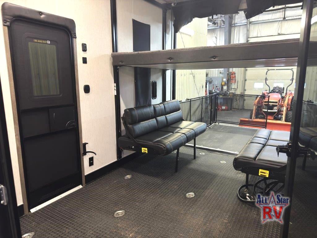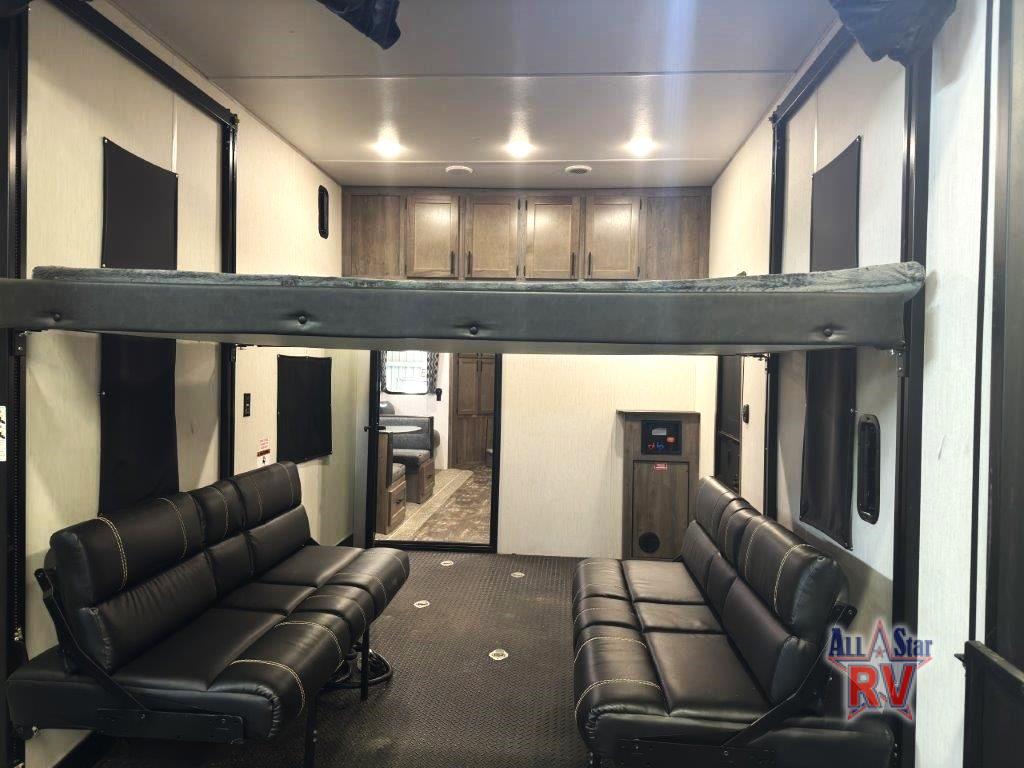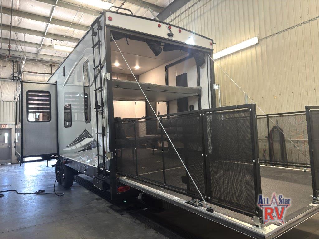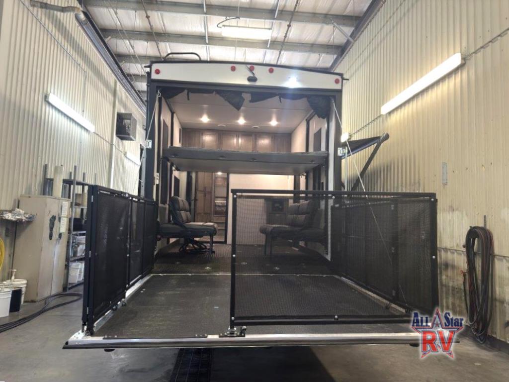 Enjoy space to relax and have fun in this toy hauler fifth wheel that can easily be converted into a bunkhouse model. Once you unload your four wheeler or dirt bikes from the 12' garage, set up the ramp door "party patio" for extra fun. The kids can enjoy lunch on the removable dinette table, or sit at the booth dinette in the main living area. There are dual entry doors for added convenience, and a large slide out so you won't trip over the napping dog. The chef of the family can prepare meals in the spacious kitchen, and the fireplace right across from the jack knife sofa will make it feel more like home. You and your spouse will love the front master bedroom that includes a Wolf Pack king bed, three wardrobes, plus your own private entrance into the dual entry bath!