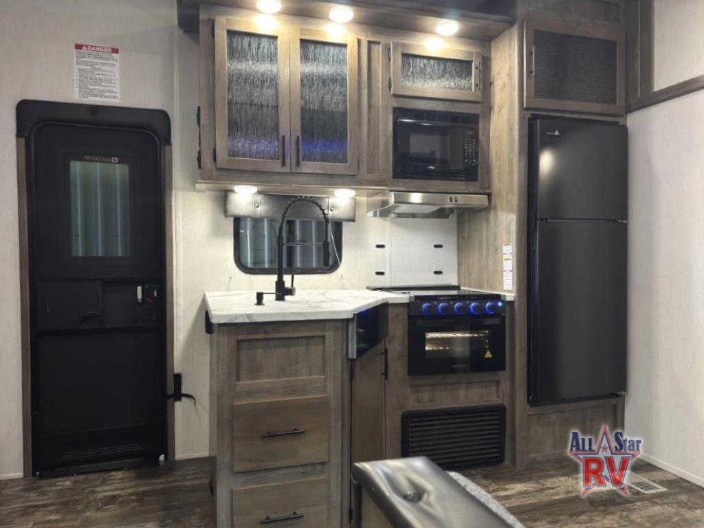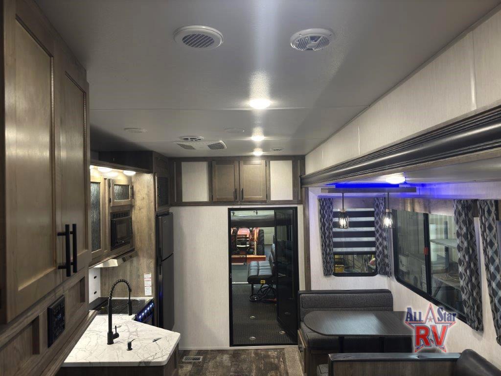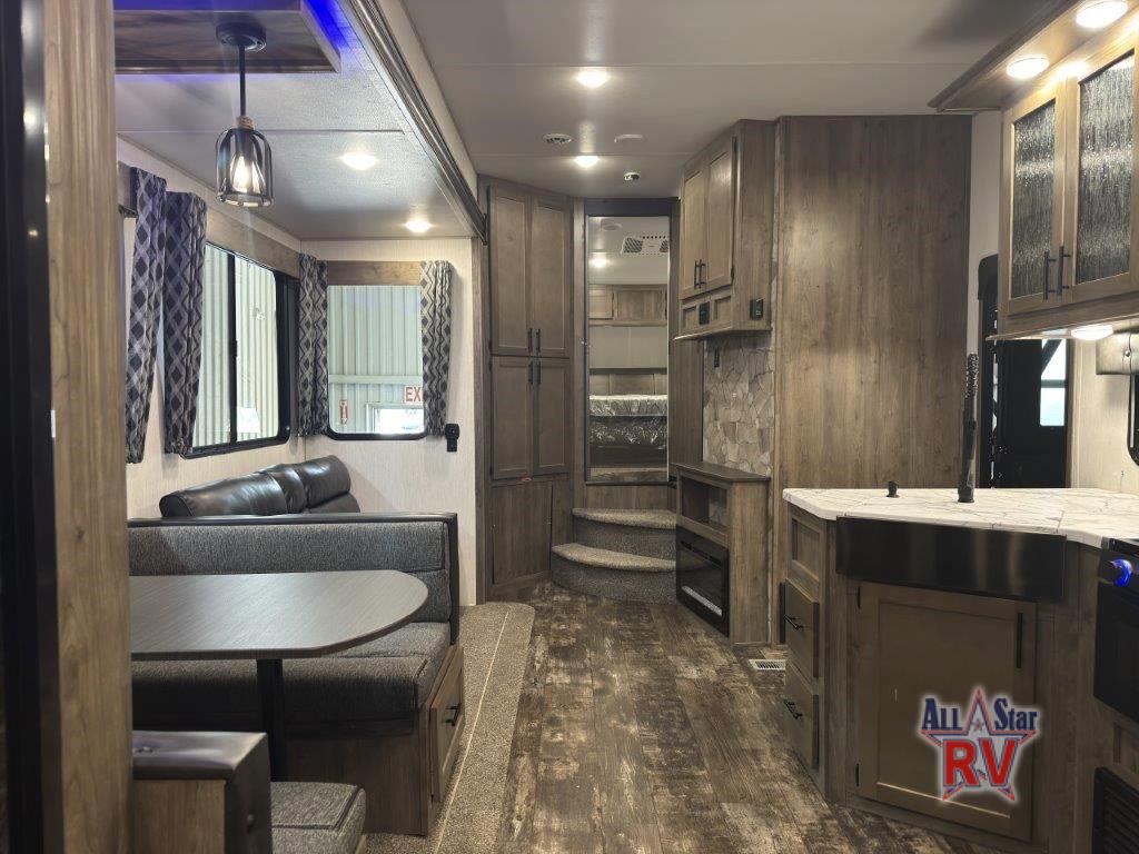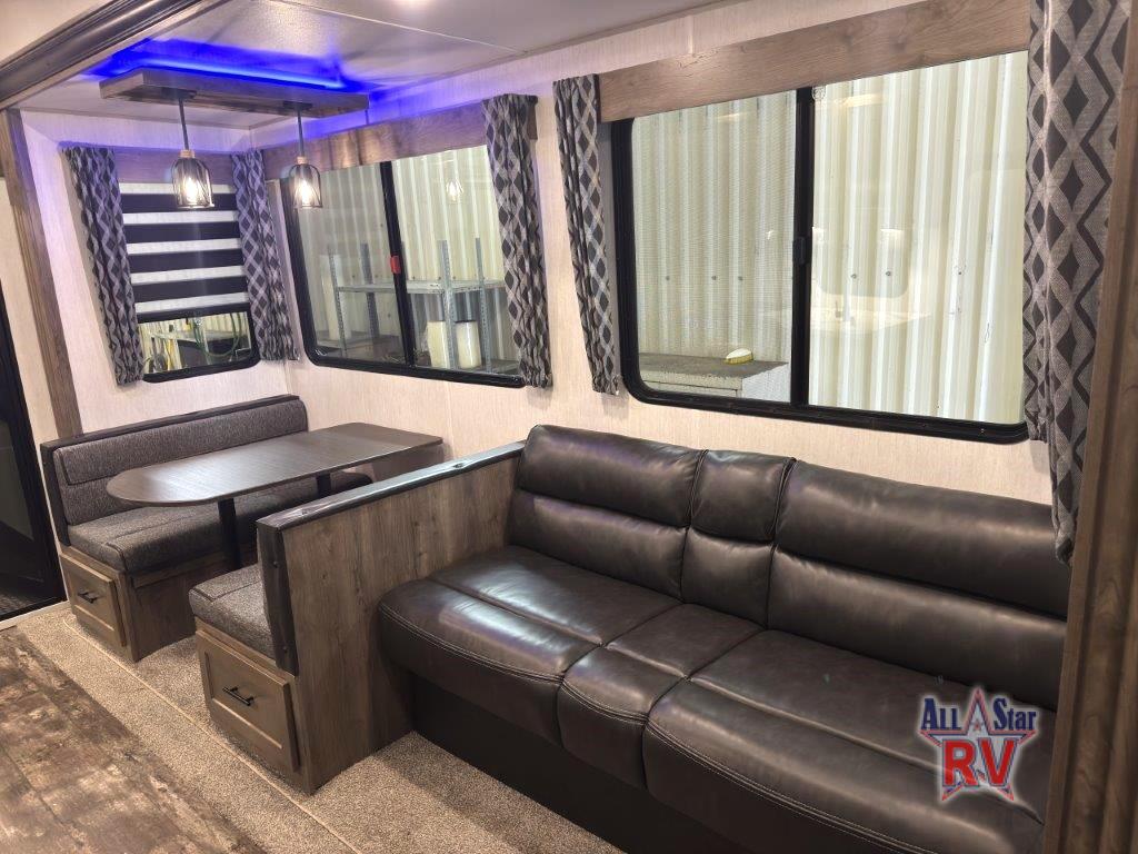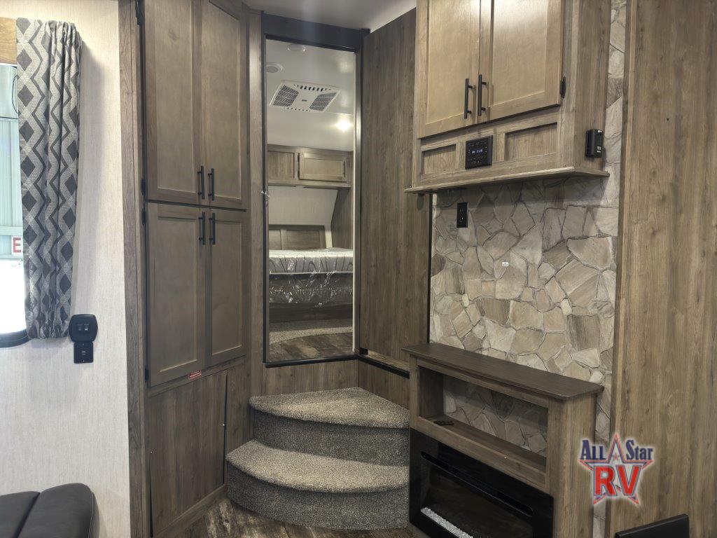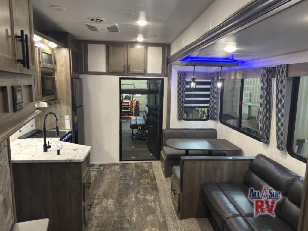 Enjoy space to relax and have fun in this toy hauler fifth wheel that can easily be converted into a bunkhouse model. Once you unload your four wheeler or dirt bikes from the 12' garage, set up the ramp door "party patio" for extra fun. The kids can enjoy lunch on the removable dinette table, or sit at the booth dinette in the main living area. There are dual entry doors for added convenience, and a large slide out so you won't trip over the napping dog. The chef of the family can prepare meals in the spacious kitchen, and the fireplace right across from the jack knife sofa will make it feel more like home. You and your spouse will love the front master bedroom that includes a Wolf Pack king bed, three wardrobes, plus your own private entrance into the dual entry bath!