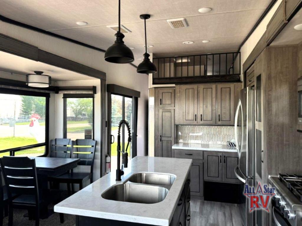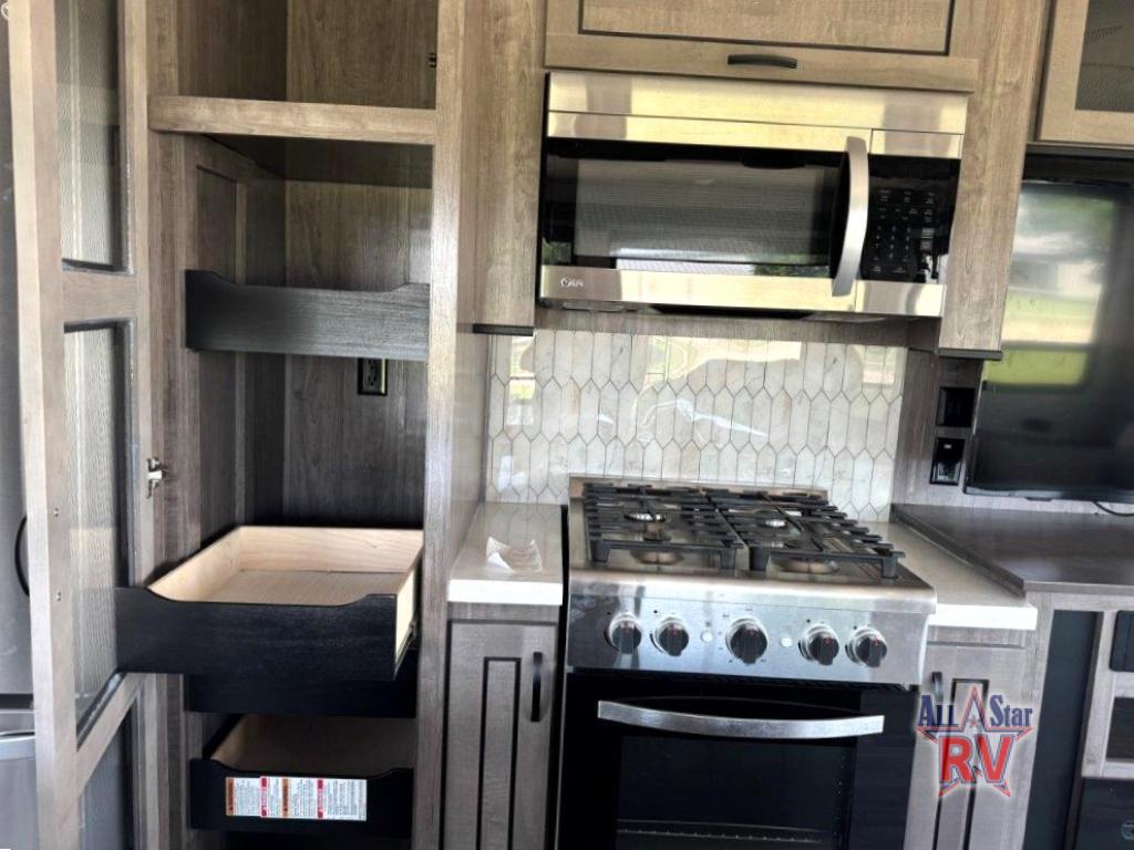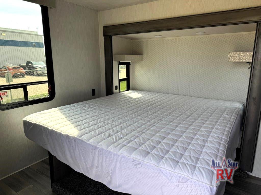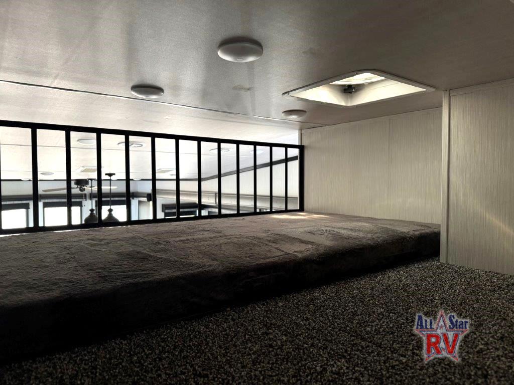 The star feature of this Cedar Creek Cottage destination trailer is the huge loft area. Take the stairs up to the loft to see the three bunk mats and wardrobe. There is also a railing that prevents anyone from falling off the edge. The rear private bedroom offers you another sleeping area with a king bed slide for the most comfort, and there is also a six-drawer dresser that you can use to store your socks and t-shirts. The full bathroom comes with a 30" x 48" fiberglass shower with seat, a bath towel rack, a toilet paper holder, a large, mirrored medicine cabinet with overhead makeup lights, and a linen closet, and the kitchen is also fully equipped with a full pantry, a one-piece backsplash, a Create-A-Breeze Fantastic Fan with thermostat and rain sensor, a stainless steel 30” over-the-range microwave with built-in vent, and crown molding that complements all overhead cabinets.