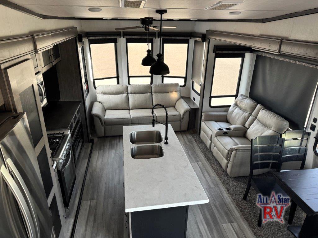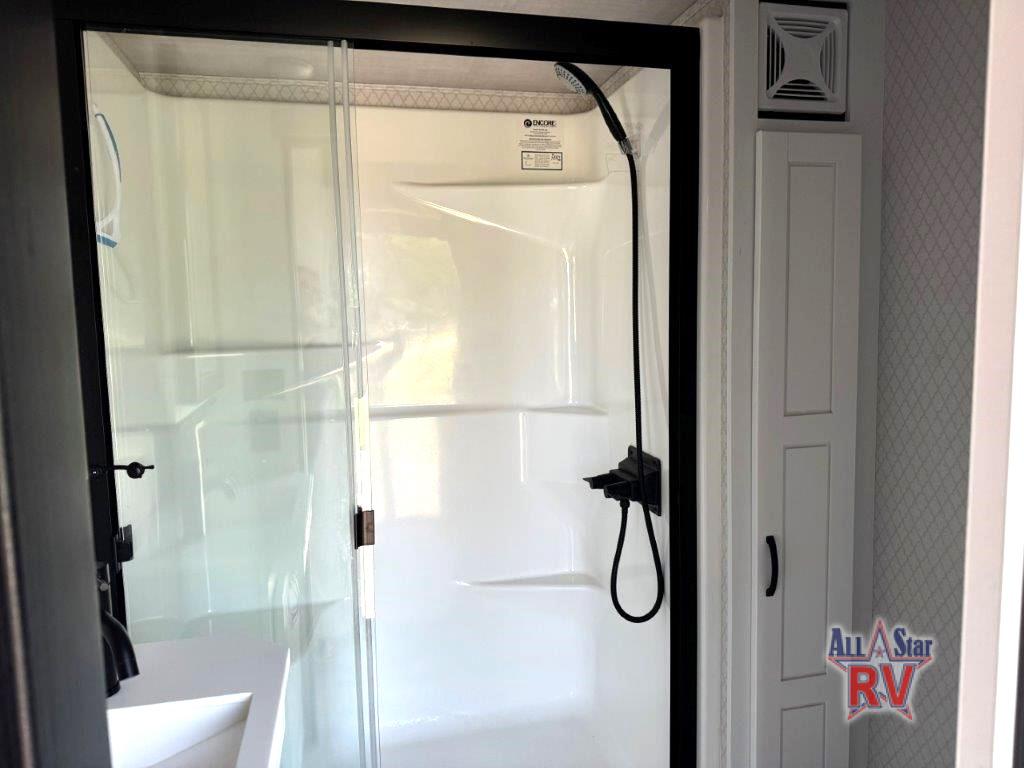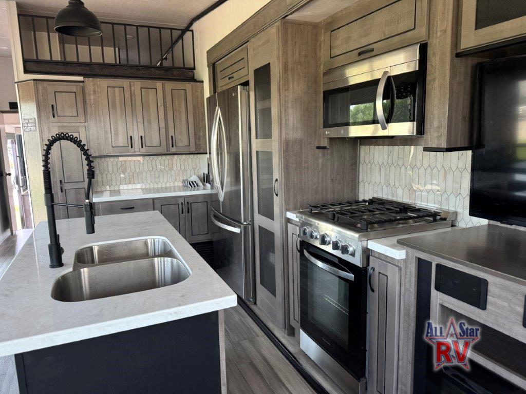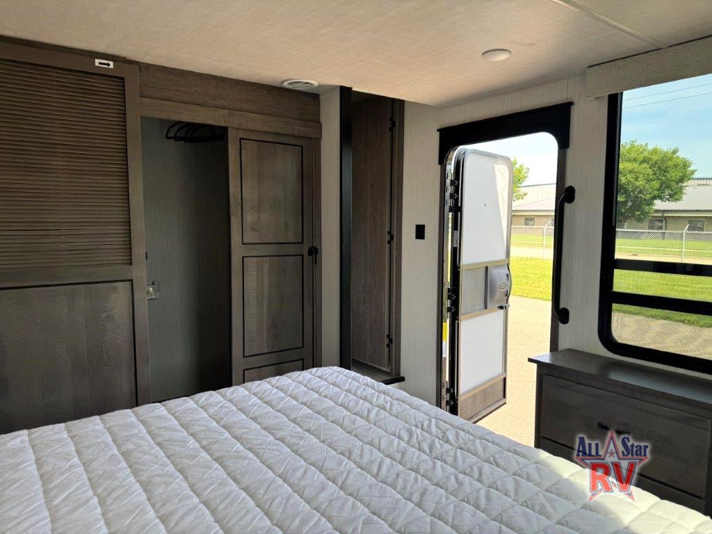 The star feature of this Cedar Creek Cottage destination trailer is the huge loft area. Take the stairs up to the loft to see the three bunk mats and wardrobe. There is also a railing that prevents anyone from falling off the edge. The rear private bedroom offers you another sleeping area with a king bed slide for the most comfort, and there is also a six-drawer dresser that you can use to store your socks and t-shirts. The full bathroom comes with a 30" x 48" fiberglass shower with seat, a bath towel rack, a toilet paper holder, a large, mirrored medicine cabinet with overhead makeup lights, and a linen closet, and the kitchen is also fully equipped with a full pantry, a one-piece backsplash, a Create-A-Breeze Fantastic Fan with thermostat and rain sensor, a stainless steel 30” over-the-range microwave with built-in vent, and crown molding that complements all overhead cabinets.