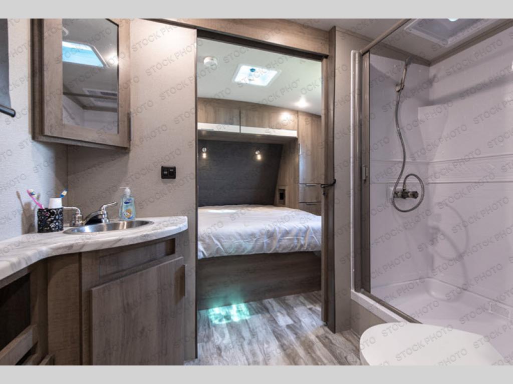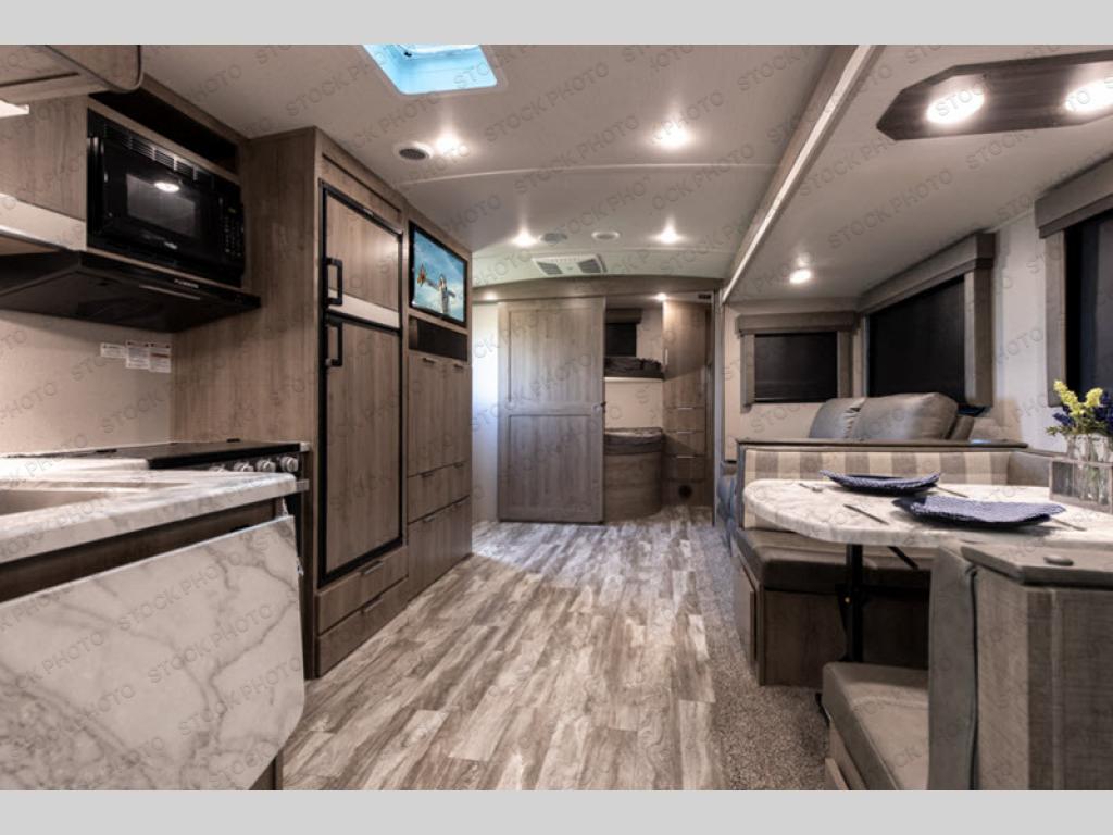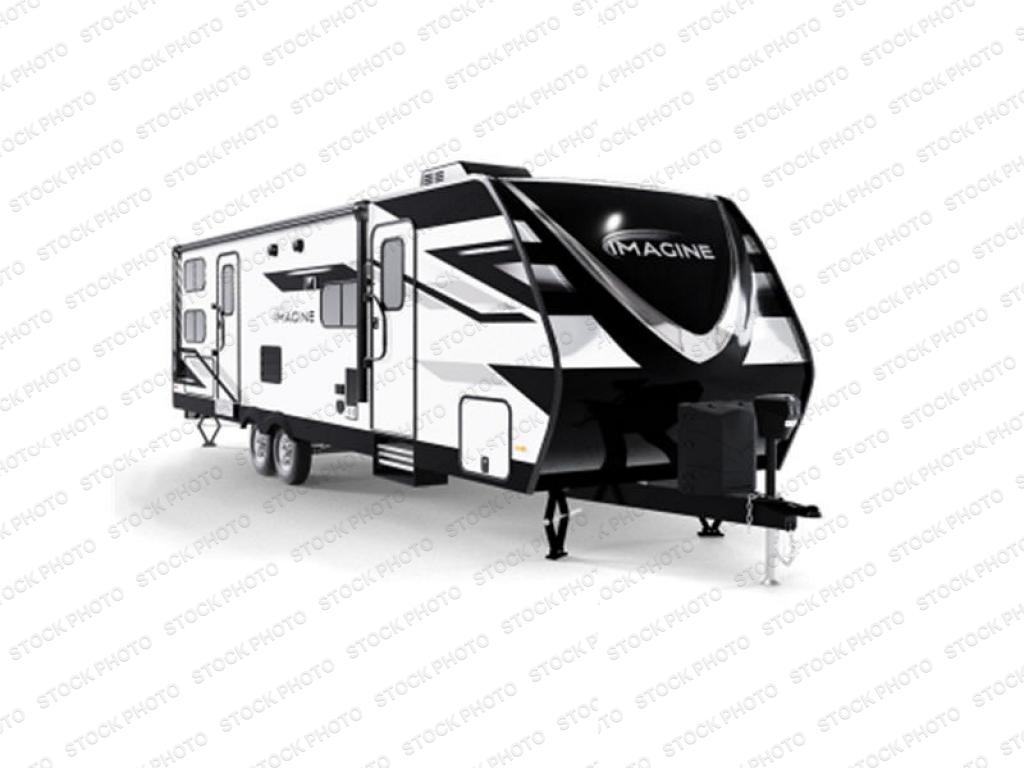 With this Imagine travel trailer, you won't have to imagine what a great camping trip will be like because you can live it! The kitchen includes everything you will need to prepare a meal for everyone, like a 10-cubic foot refrigerator, three-burner range with oven, microwave, stainless steel sink, and flip-up countertop extension. There is a pet dish below the refrigerator, and the LED HDTV sits across from the tri-fold sofa and U-shaped dinette with removable ottoman so that you can watch a movie or the big game in comfort. Another great addition is the private bunkhouse because it provides you with a second secluded sleeping space. This bunkhouse includes a wardrobe, drawers, and an area prepped for a TV.