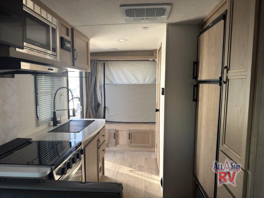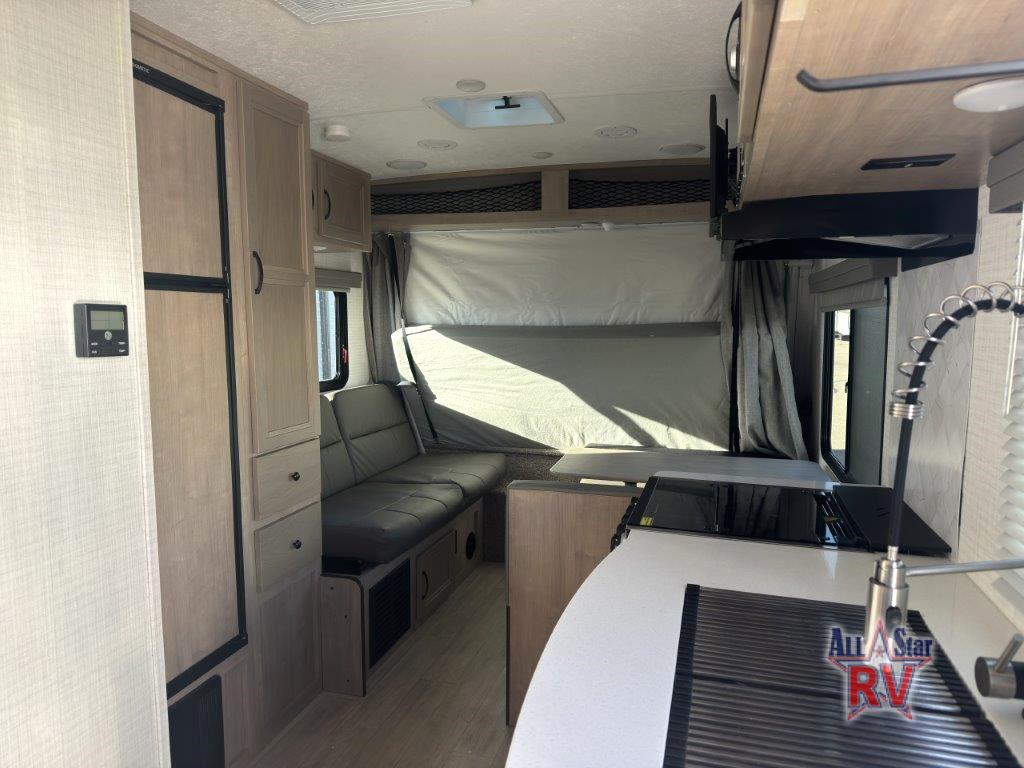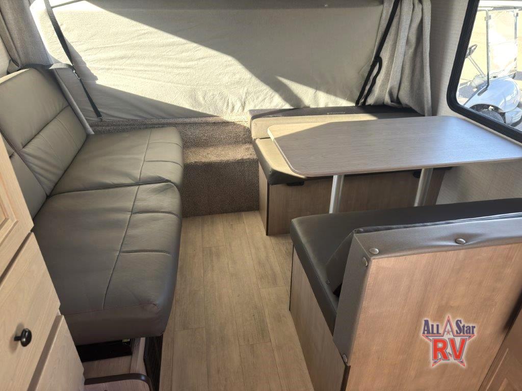 Whether you plan to spend your camping days outdoors or indoors, you'll always have a good time with this hybrid expandable. The 10' power awning with LED lights will provide an outdoor living space you are sure to love, or you can head inside to relax on the booth dinette and sofa. The chef can whip up lunch on the range or use the microwave oven, and the 11 cu. ft. refrigerator can hold your leftovers. A full bath comes standard so you don't have to use the camp's facilities, plus there are two queen tent end beds for a great night's rest!